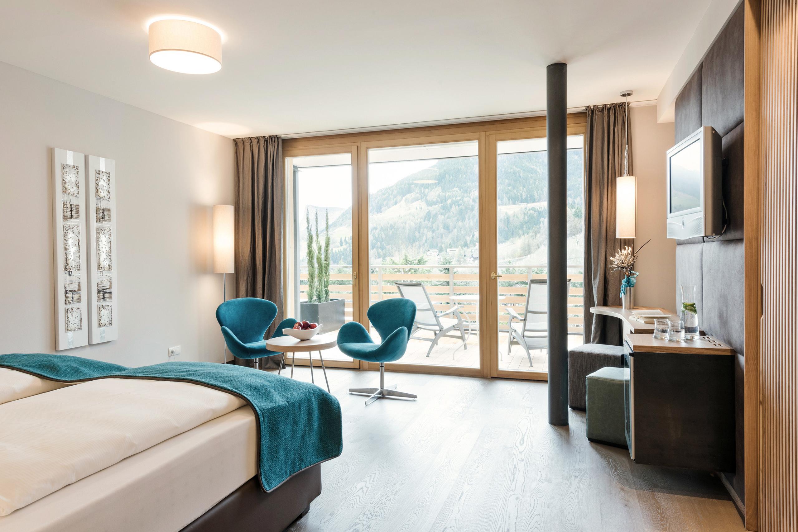 Das Doppelzimmer Deluxe bietet das Plus an Fernsicht! Die Lage im 1. Stock verspricht schönste Blicke auf den ALPIANA Poolgarten. Hohe Fenster und der nach Süden ausgerichtete Pergola-Balkon (8 m²) sorgen dafür, dass das “Deluxe”-Zimmer hält, was es verspricht. Im Innen spielt Ästhetik die tragende Rolle: Textilien in Petrolblau bilden den Kontrast zum erdfarbenen Eichenfußboden. In stilvollem Ambiente und einem Wohlfühl-Doppelbett schläft es sich besonders erholsam.