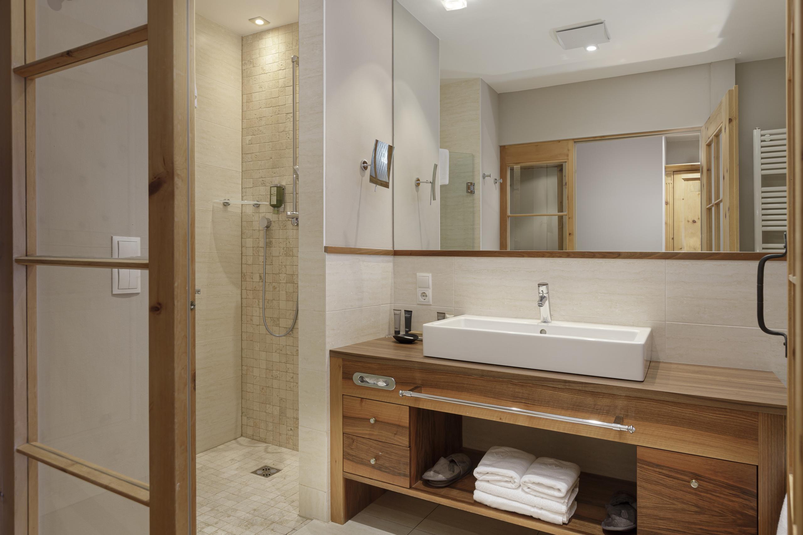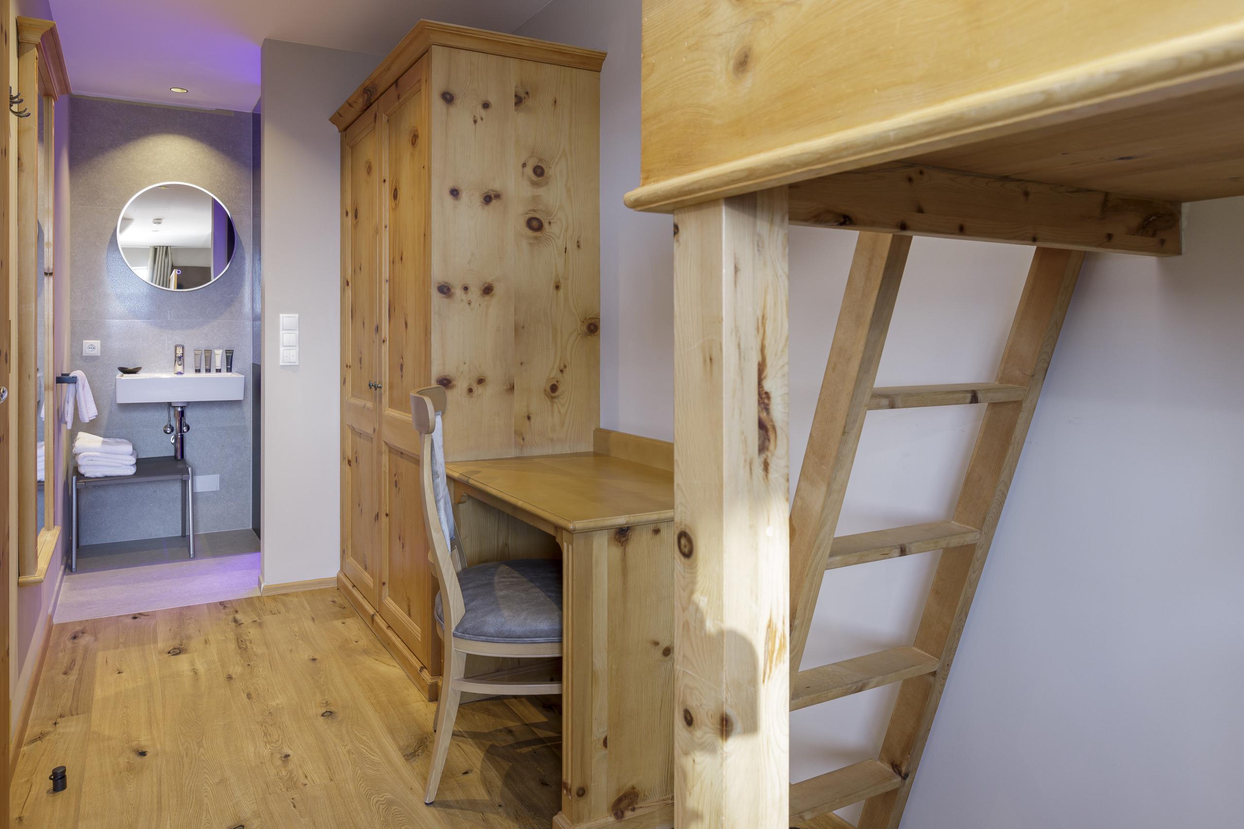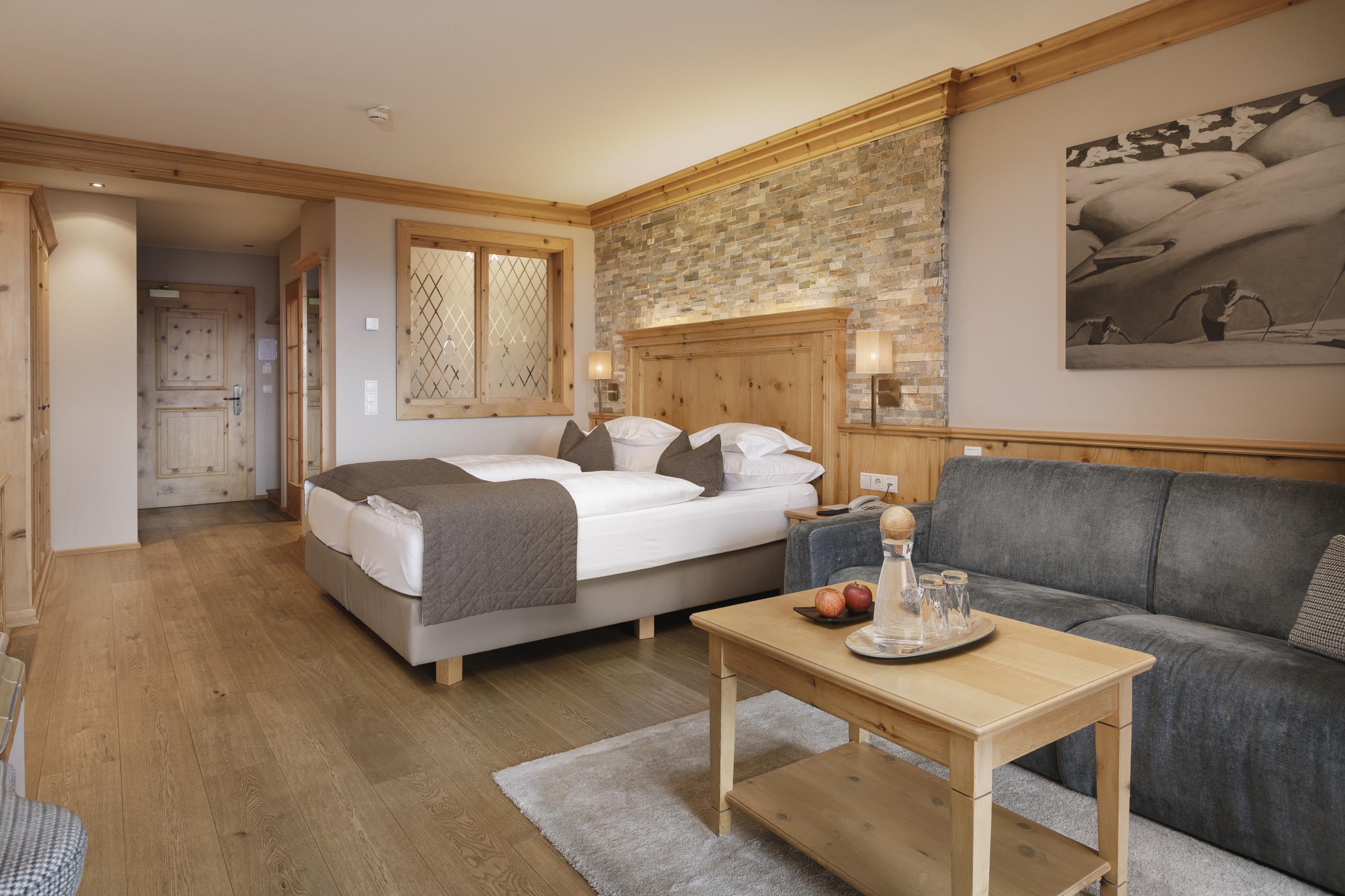 Familiensuite | 2-6 Personen | ein großzügiger Wohn- Schlafbereich mit Doppelbett | abgetrenntes Kinderzimmer mit Stockbett | Badezimmer mit Erlebnisdusche | Badewanne | abgetrenntes WC mit Bidet | großzügiger Schrank inkl. Schuhregal | Safe | Sat-TV/Radio | Telefon | Minibar | Tee-Set | Nespresso-Maschine | Wifi