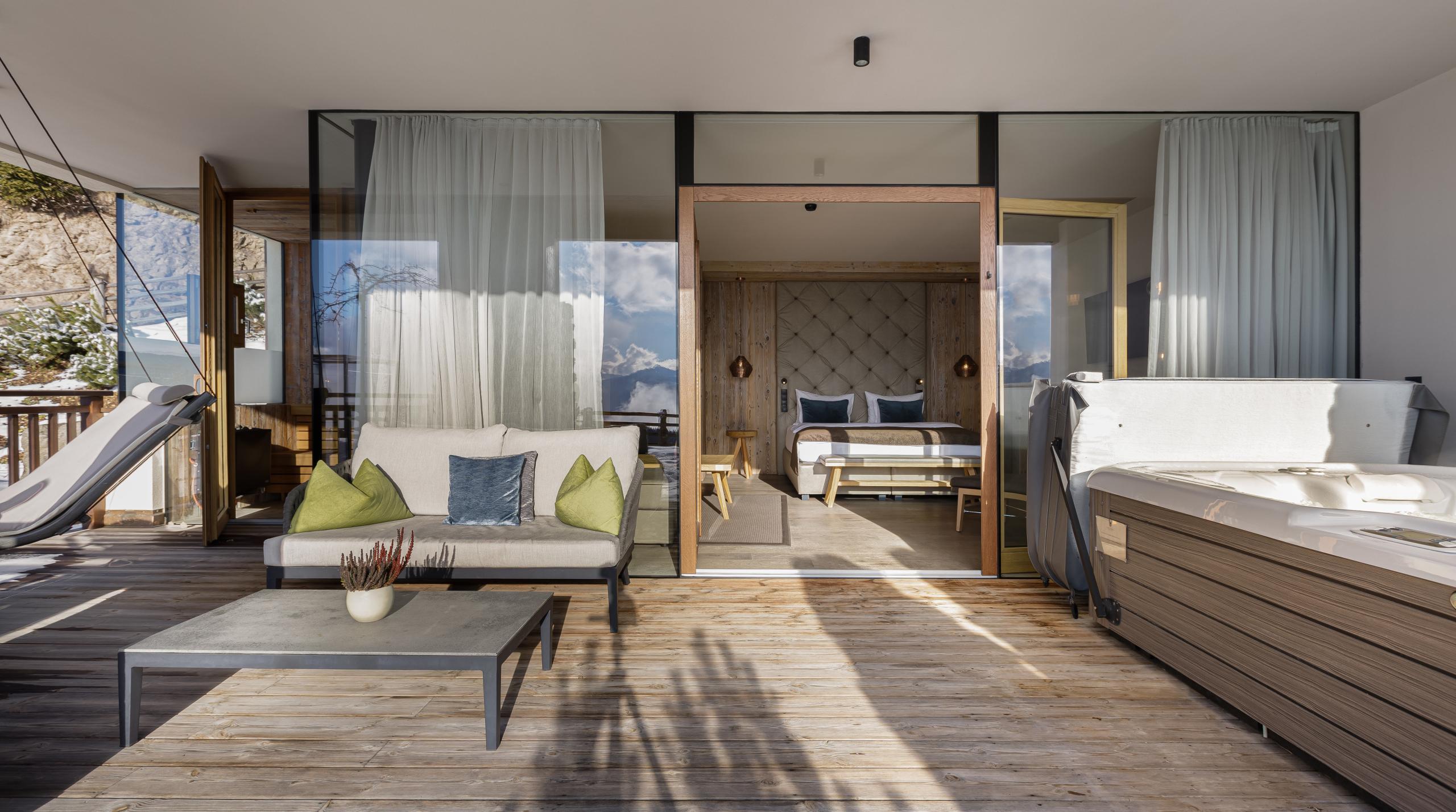 Luxuriöse Familiensuite | 2-6 Personen | großzügiger Wohn-/Schlafbereich mit Luxus-Boxspringbett mit Gesundheitsschlafsystem | Relaxliege | privater Außenwohnbereich mit Whirlpool | separates Zweibettzimmer mit Panoramafenster | Schmink-/Schreibtischkombination | großes Bad mit begehbarer Dusche für zwei Personen | separates WC und Bidet | Doppelwaschbecken | großzügiger Kleiderschrank inkl. Schuhschrank | Safe | Sat-TV/Radio | Telefon | Minibar | Teeset | Nespresso-Maschine | Wifi