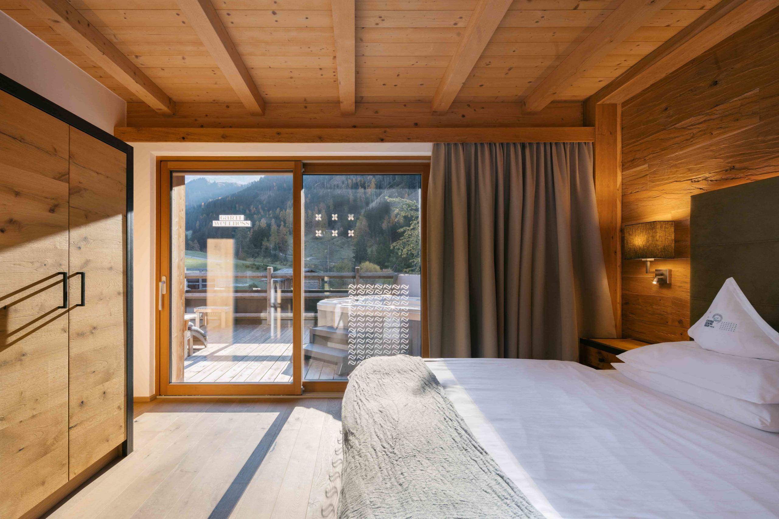 Drinnen: Zirbenduft, klare Linien, wohltuende Ruhe.