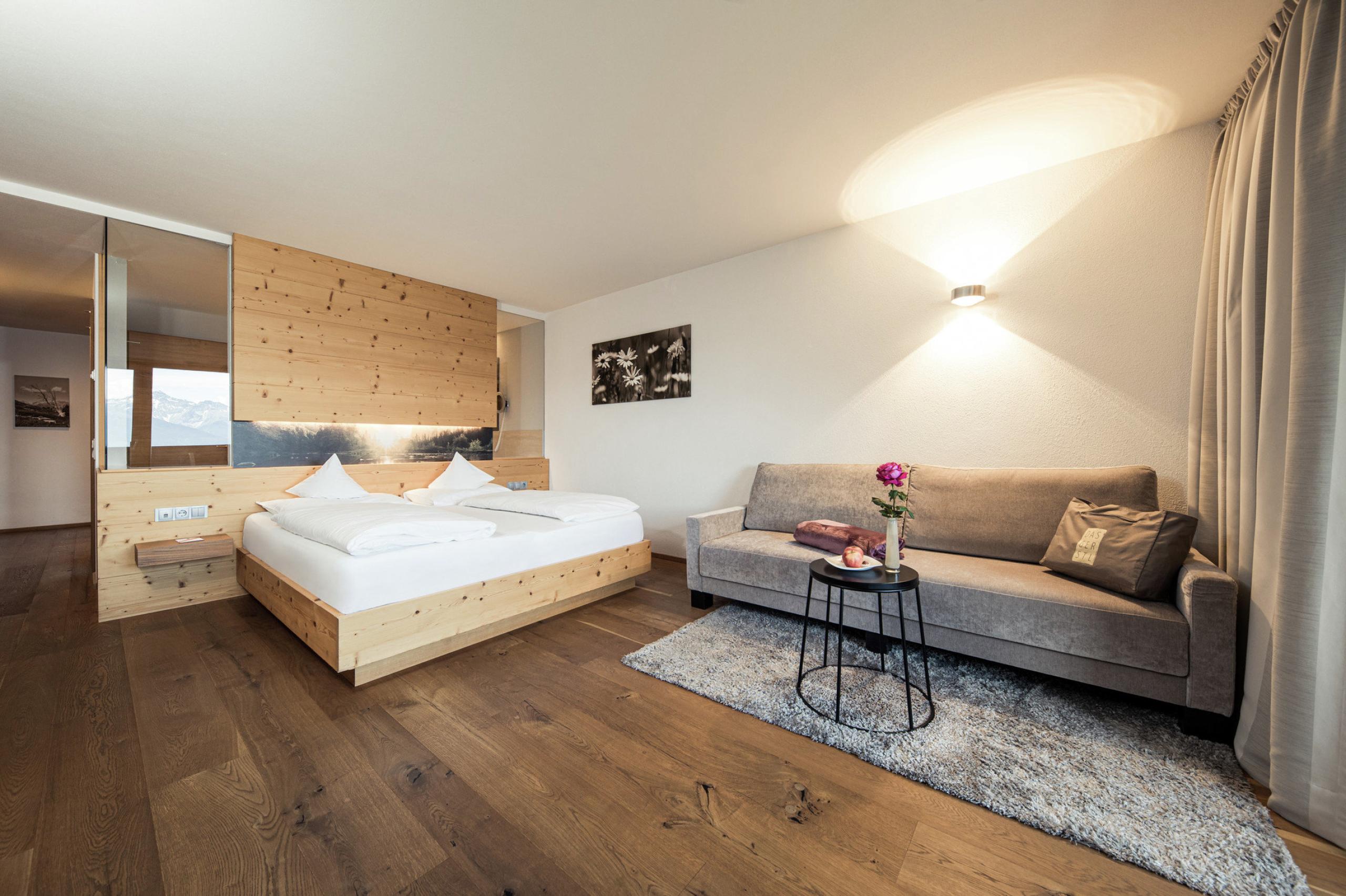 Im Doppelzimmer Ortler Superior genießen Sie Naturholzboden und den großartigen Panoramablick über den Vinschgau von Ihrem Balkon. Badezimmer mit Badewanne zum Relaxen.
