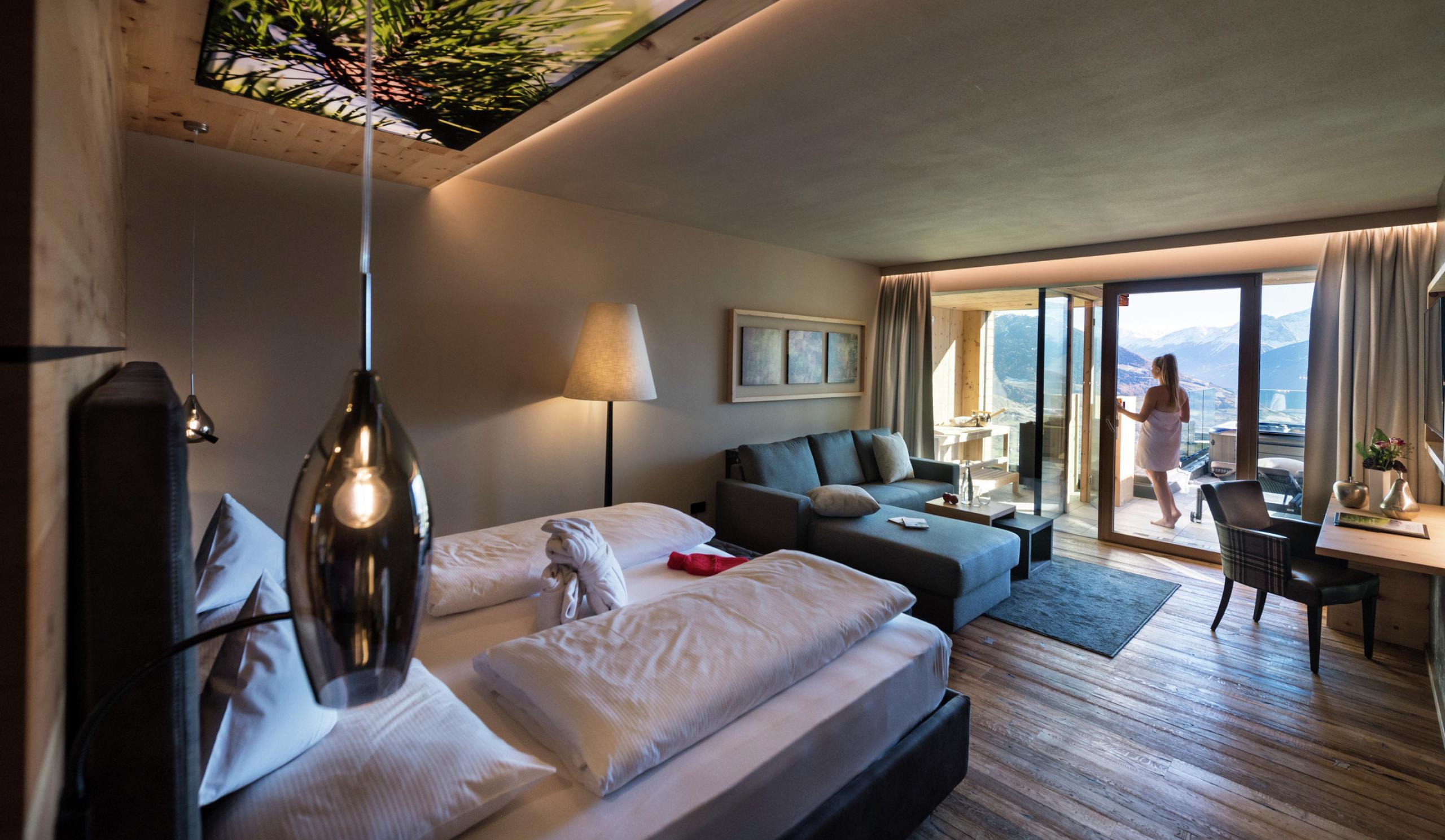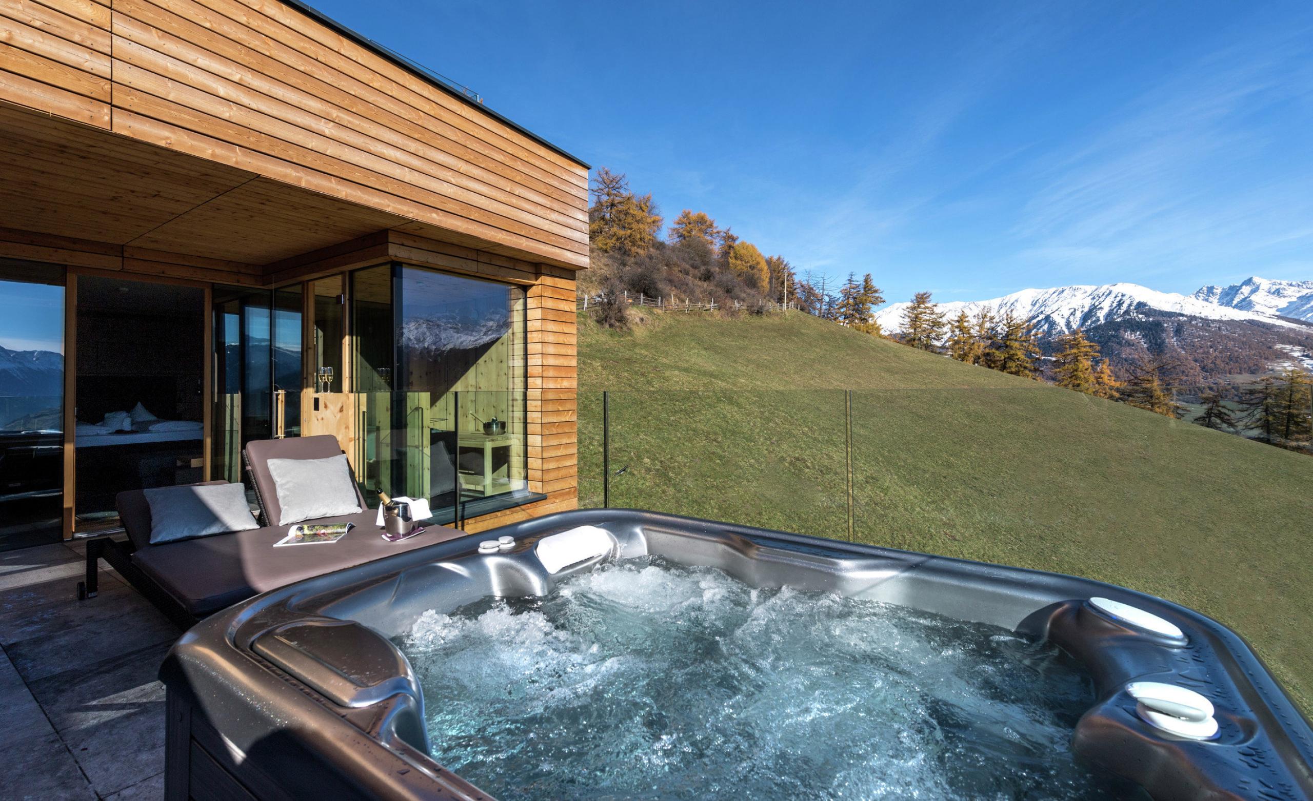 Genießen Sie das wunderschöne Panorama, aus Ihrem eigenen Whirlpool auf der Terrasse der Valvel Suite. Zudem bietet diese beeindruckende Suite eine eigene Kombi-Sauna und ist komplett mit duftendem Zirbenholz ausgestattet.