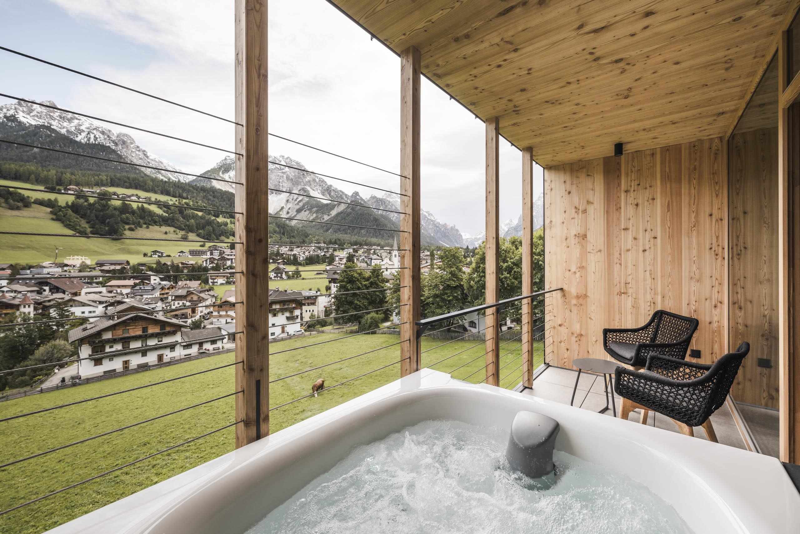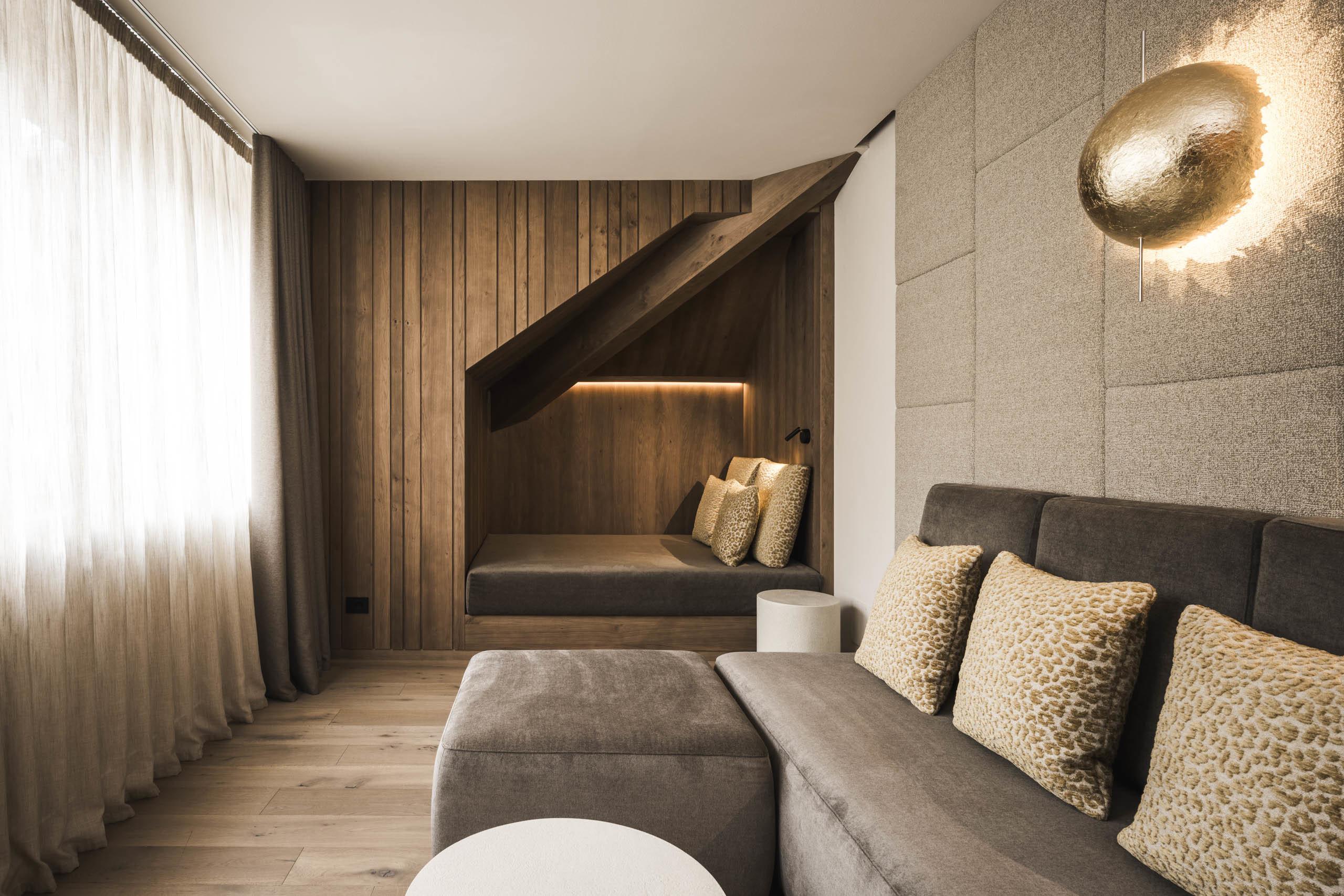 Premium-Suite im Chalet-Stil in der obersten Etage mit 80 m² und 20 m² Balkon, Naturholzausstattung und Naturholzboden. Schlafzimmer mit Kingsize-Doppelbett, separates Wohnzimmer mit Couch, die bei Bedarf in drei separate Betten umgewandelt werden kann, Arbeitstisch. Elegantes Badezimmer mit großzügiger Relax-Dusche, private kombinierte Finnische- und Infrarotsauna, Waschtisch, Lady-Schmink-Desk, WC und Bidet getrennt. Zweites Badezimmer mit großzügiger Relax-Dusche, Waschtisch und WC. Minibar mit Nespresso und Tee-Ecke, Telefon, LED Sat-TV, Safe, kostenloses WLAN. Kuschelige Bademäntel, Badetücher, Badeschuhe, Rucksack. Überdachter Südbalkon mit Minipool Jacuzzi und Liegestühlen. Blick auf die Wiese, St. Vigil und die Dolomiten. Garagenplatz inkludiert. Keine Haustiere erlaubt.