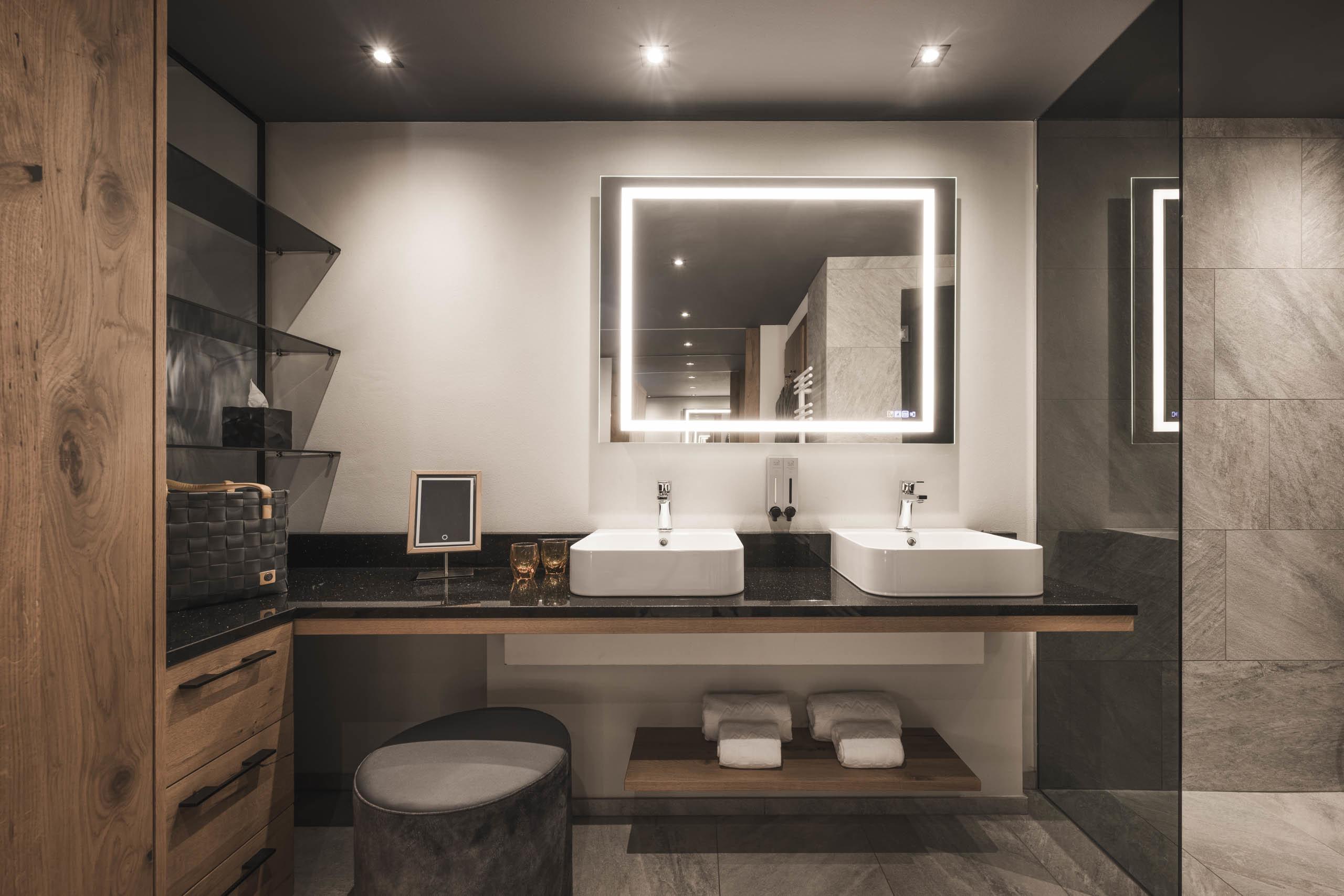 Elegantes Wohn-Schlafzimmer de luxe im Chalet-Stil mit 37 m² und 7 m² Balkon, Naturholzausstattung und Naturholzboden. Kingsize-Doppelbett, komfortable Chaise Longue, Schreib-/Arbeitstisch, Wohn-Badezimmer mit Schrank, großzügige Relax-Dusche, WC und Bidet getrennt, Doppelwaschtisch in Marmor, Lady-Schmink-Desk. Minibar mit Nespresso und Tee-Ecke, Telefon, LED Sat-TV, Safe, kostenloses WLAN. Kuschelige Bademäntel, Badetücher, Badeschuhe, Rucksack. Überdachter Ostbalkon mit Panoramablick auf die Dolomiten. Garagenplatz inkludiert. Keine Haustiere erlaubt. Die Bilder dienen als Beispiel, die Möblierung oder der Grundriss können variieren.