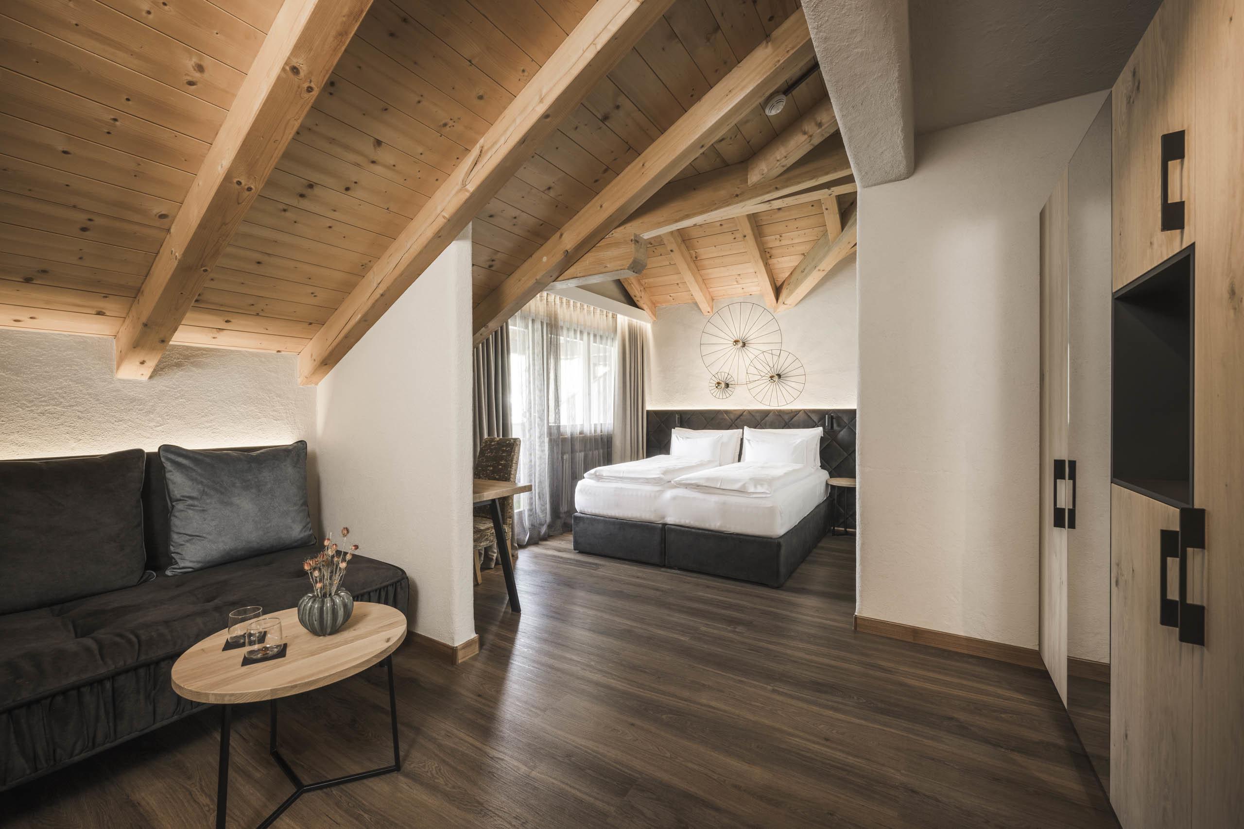 Wohn-Schlafzimmer im modernen alpinen Style mit 33 m², Holzausstattung und Holzboden. Kingsize-Doppelbett, Schreib-/Arbeitstisch, Badezimmer mit Dusche, WC und Bidet, Waschtisch, Kosmetikspiegel, Föhn, Telefon, Sat-TV, Safe, Minibar, kostenloses WLAN. Kuschelige Bademäntel, Badetücher, Badeschuhe, Rucksack. Balkon mit Panoramablick. Die Bilder dienen als Beispiel, die Möblierung oder der Grundriss können variieren.