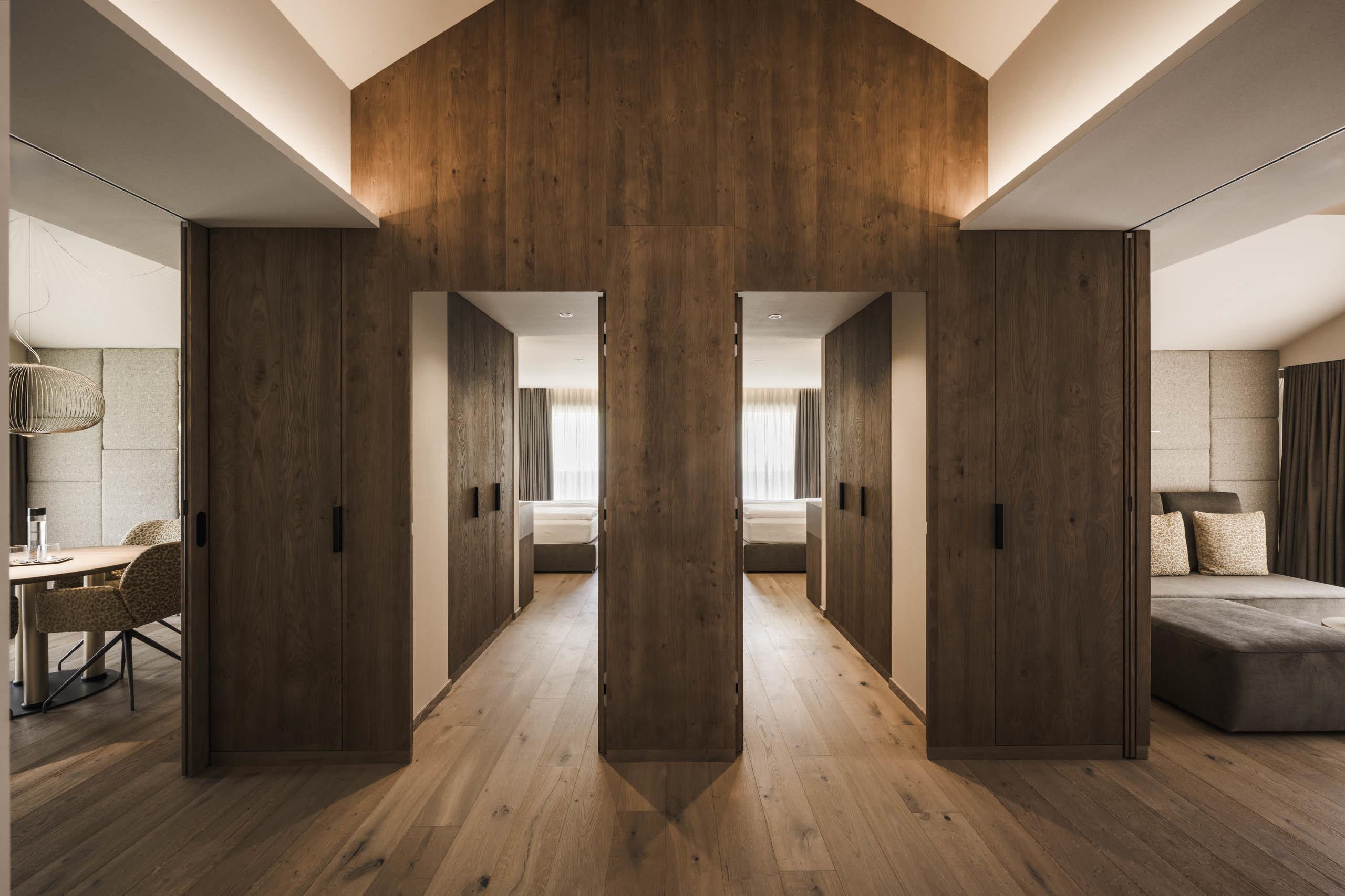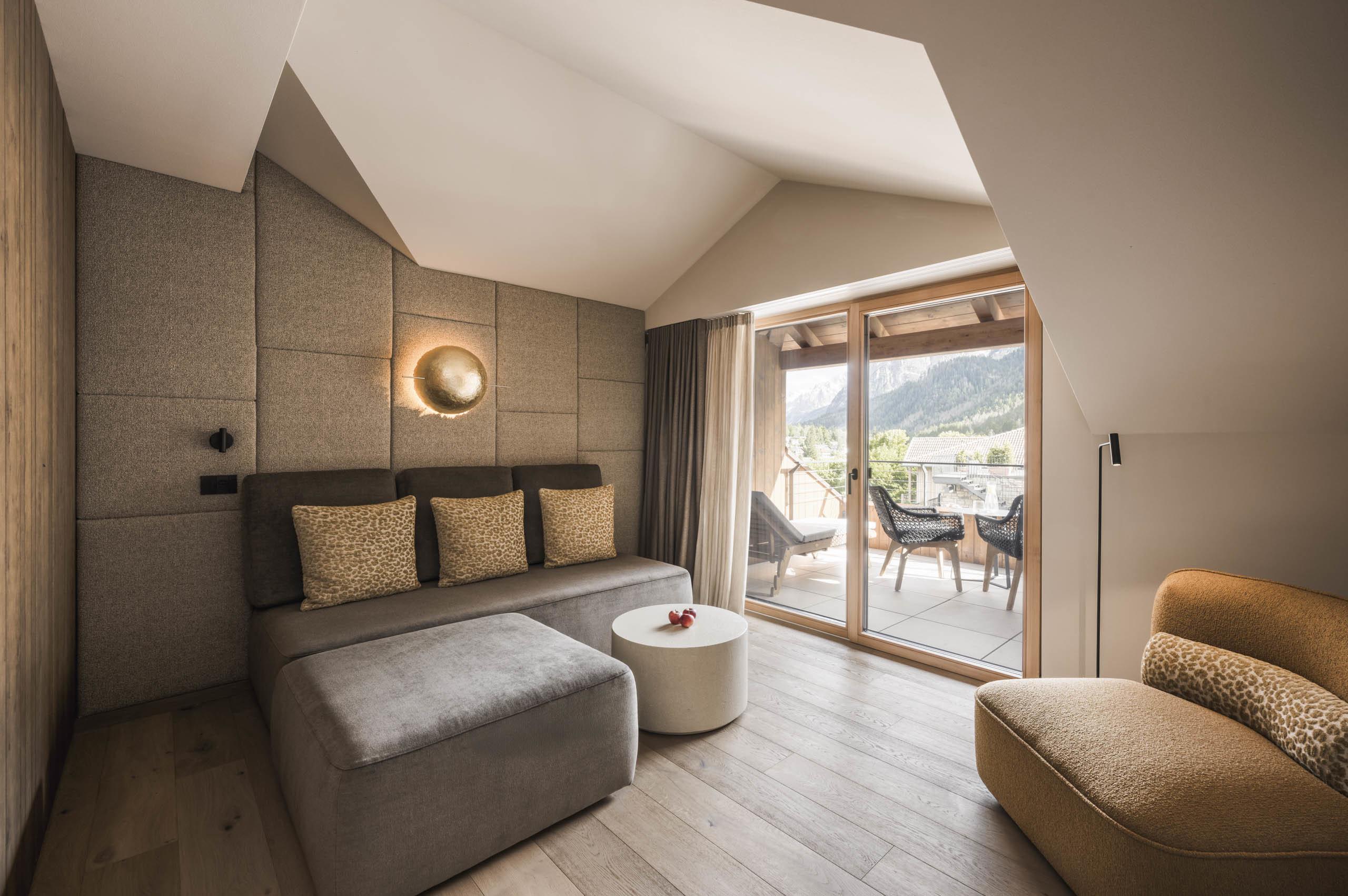 Luxuriöse Eck-Familiensuite im Chalet-Stil im obersten Stockwerk mit 90 m² und 3 Balkonen mit einer Gesamtfläche von 20 m², Naturholzausstattung und Naturholzboden. 2 Wohnzimmer: eines mit Chaise Longue und eines mit Arbeitstisch. 2 Schlafzimmer mit Kingsize-Doppelbett, 2 Luxus-Badezimmer mit großzügiger Relax-Dusche, WC, Bidet und Waschtisch. Minibar mit Nespresso und Tee-Ecke, Telefon, 3 LED Sat-TV, Safe, kostenloses WLAN. Kuschelige Bademäntel, Badetücher, Badeschuhe, Rucksack. 3 überdachte Balkone in drei verschiedenen Richtungen mit sonniger Aussicht, Blick auf das Dorf und die Dolomiten, die Wiese, die Skipisten und den Kronplatz. Garagenplatz inkludiert. Keine Haustiere erlaubt.