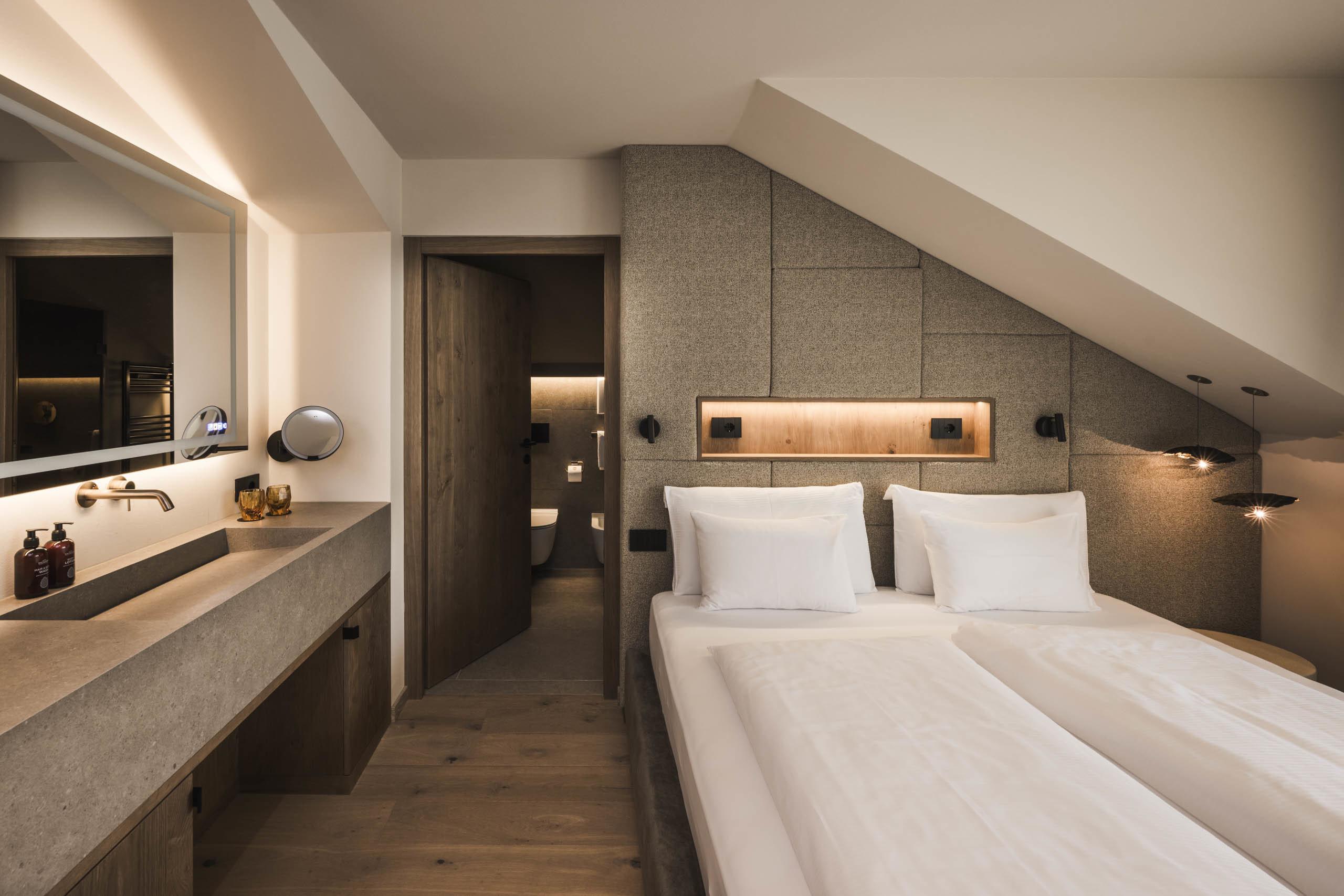 In unseren Zimmern und Suiten haben wir unsere Lieblingsberge ins Resort geholt: Genießen Sie ein luxuriöses und gleichermaßen komfortables Ambiente, das von wärmendem Stein und heimischen Hölzern, den wohltuenden Düften von Almkräutern und feinstem italienischen Design geprägt ist.