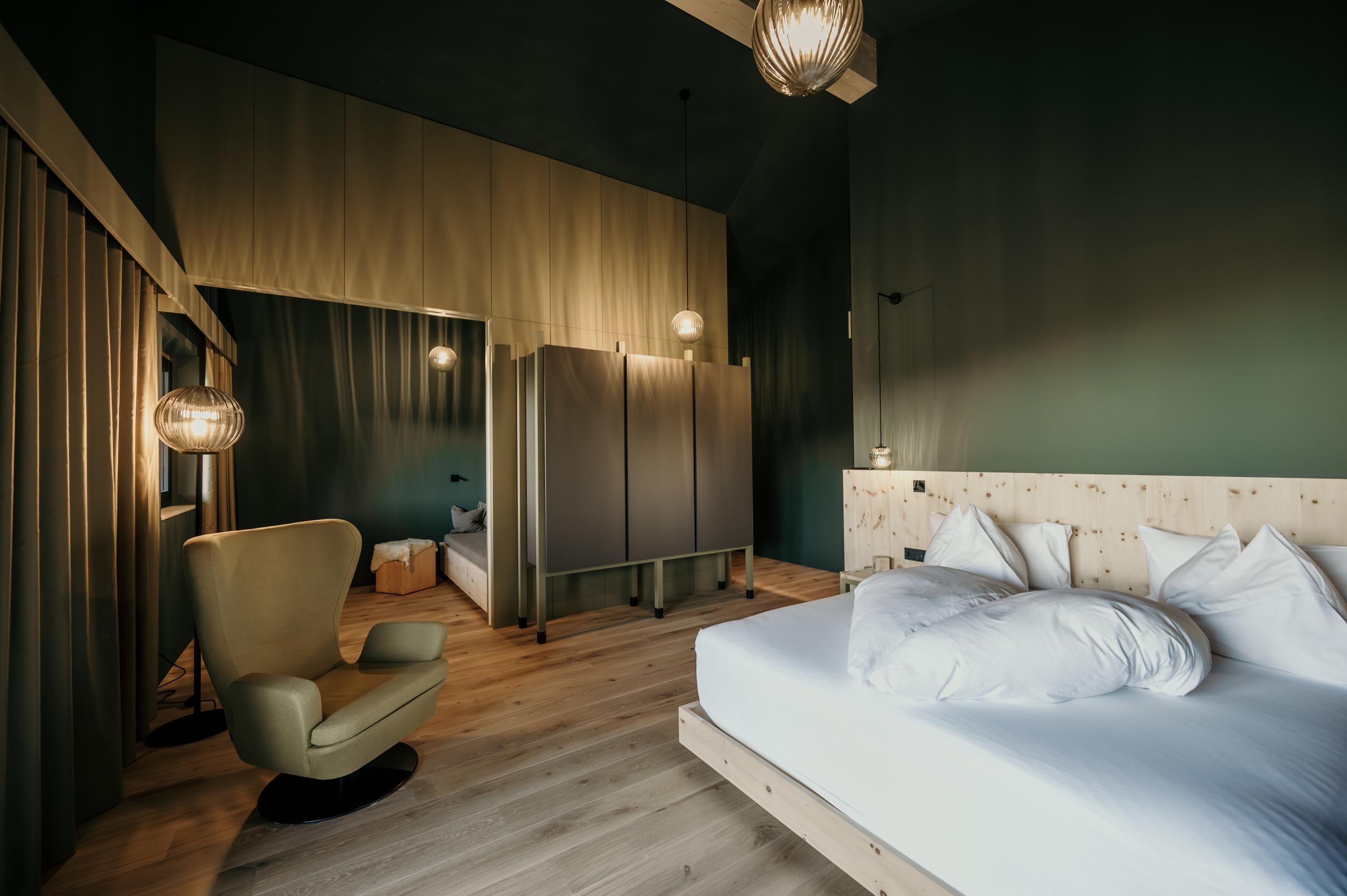 Die Suite Arve ist eine traumhaft schöne Suite im Stammhaus mit Blick in den Pfösl Hof: modern eingerichtet in duftendem Zirbenholz, mit seinen positiven Auswirkungen auf eine bessere Schlafqualität. Das Zirbenholz reduziert die Herzfrequenz und sorgt somit für innere Ruhe und erholsamen Schlaf: Schlafbereich mit natürlichem Simmons Natural Heritage Wohlfühl-Schlafsystem handgefertigt aus 100% natürlicher Baumwolle, gefüllt mit reiner Schafwolle vom Villnösser Brillenschaf aus Südtirol. Für ein besonderes Schlaferlebnis inmitten der Natur. Der Wohnbereich kann mit einer Schiebetür vom Schlafzimmer abgetrennt werden, modernes Bad mit Dusche, Panoramabalkon mit Outdoor Liegen zum Genießen, Bademantel, Wellnesstasche, Fön, Safe, SAT-TV, Minibar und W-LAN. Ideal für Paare, die gern einen getrennten Wohn- und Schlafraum haben und für Familien.