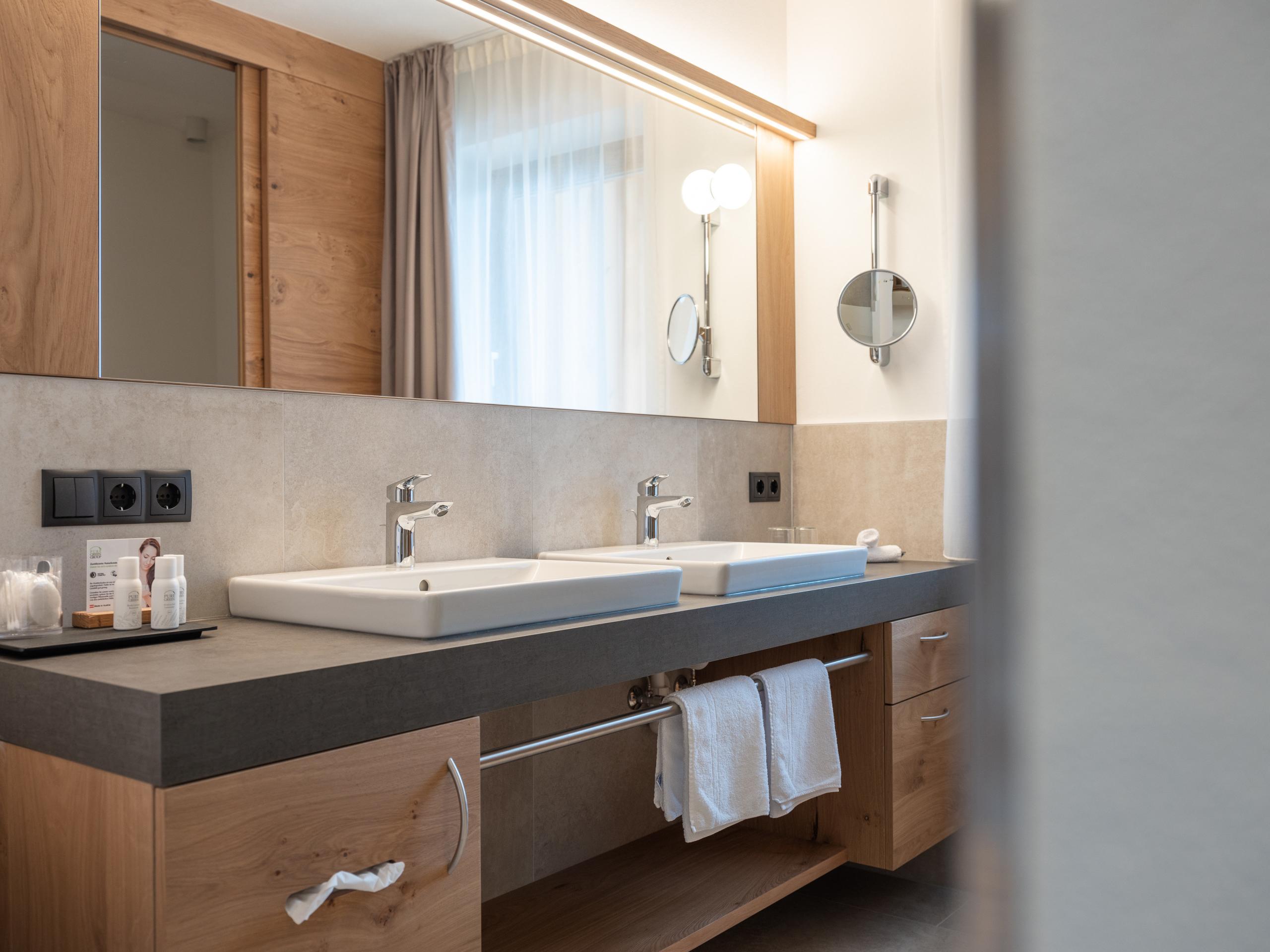 Moderne Suite mit Natureiche eingerichtet, traumhaftem Blick in die Dolomiten, zwei Schlafzimmern und zwei Badezimmern