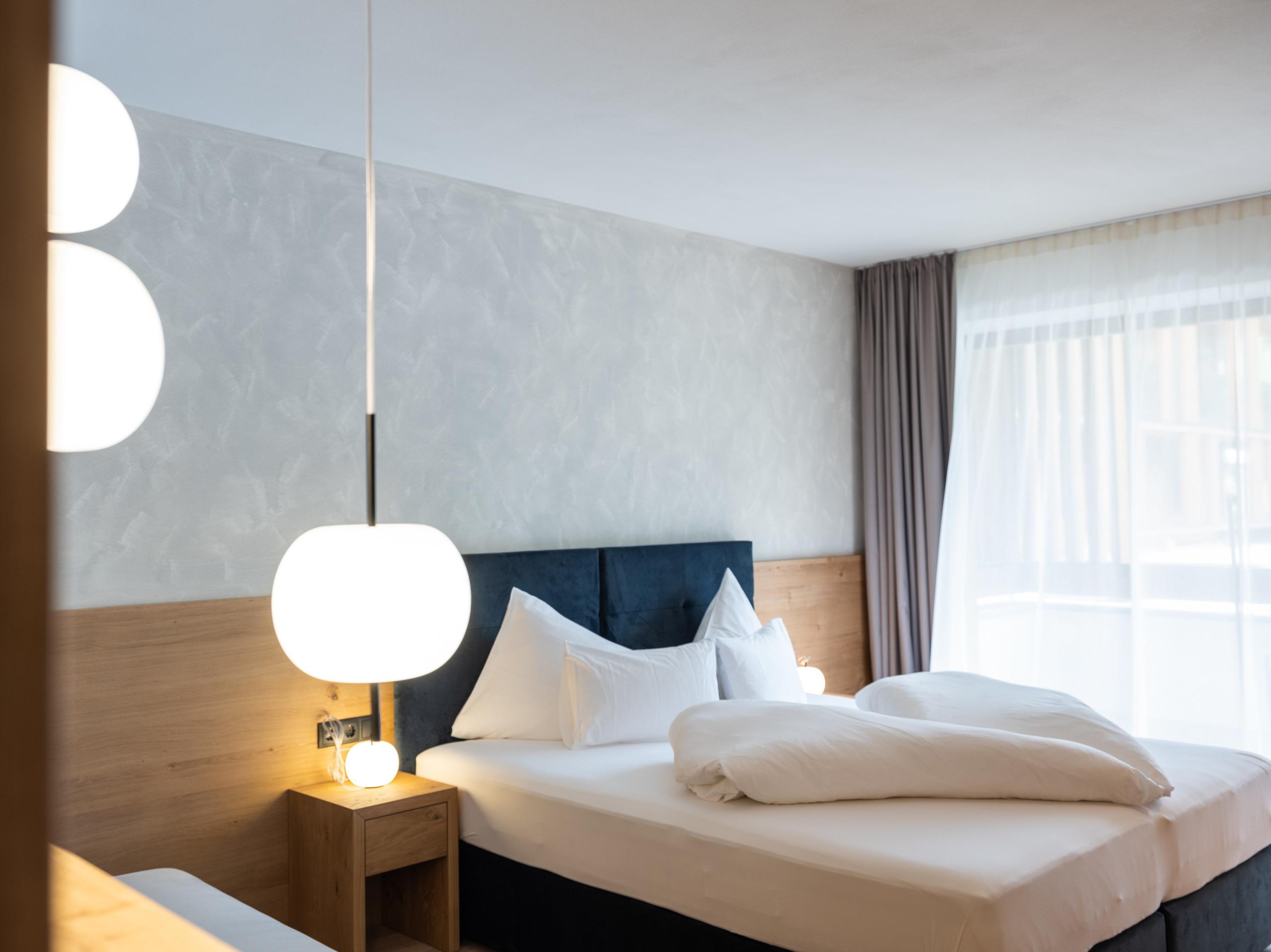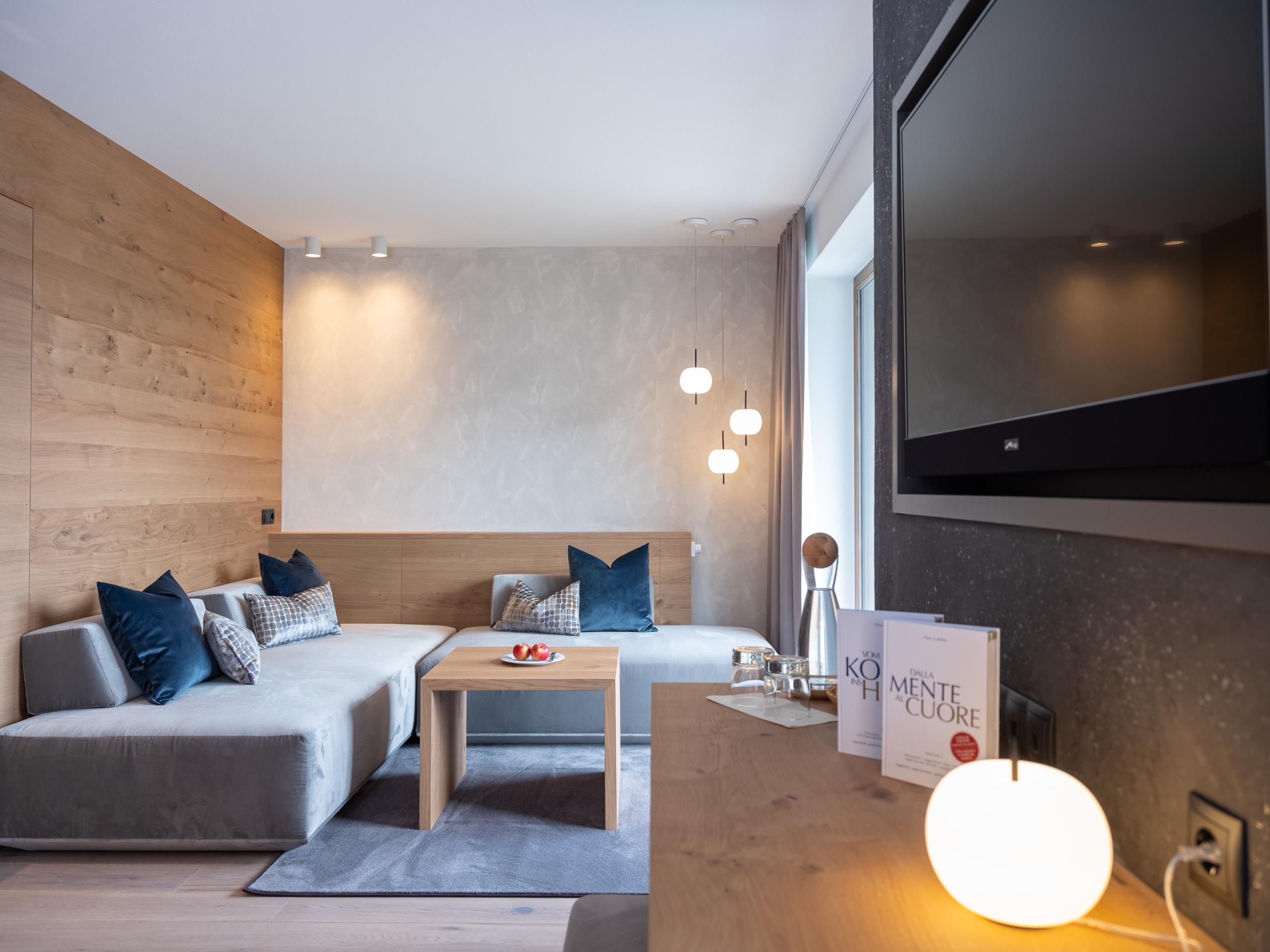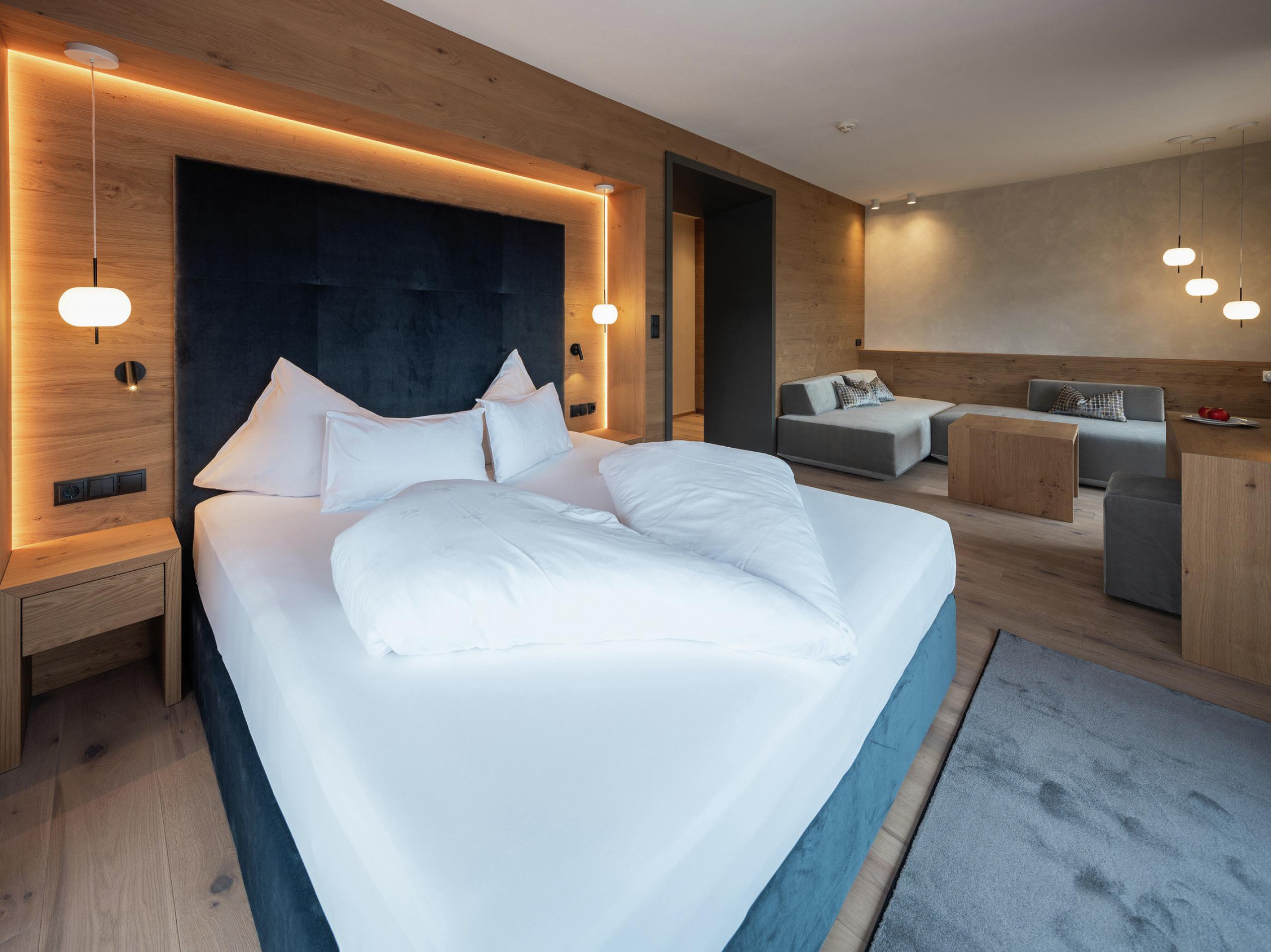 Holzboden. Kuschelbett mit einer Länge von 2,10 m und direktem Blick auf das wunderbare Bergpanorama. Couch. 49 Zoll Flachbildschirm. Free WiFi. Safe. Minibar. Cremesso-Kaffeemaschine. Balkon mit Dolomitenblick. Badezimmer mit Erlebnisdusche. Föhn und Kosmetikspiegel. Abgetrennte Toilette und Bidet. Zweites Schlafzimmer mit Doppelbett, eigenem Badezimmer und Flachbildschirm. Wellnesstasche mit Bademänteln, Badetüchern und Kuschelbadeschlappen. Tiefgaragenplatz inklusive.