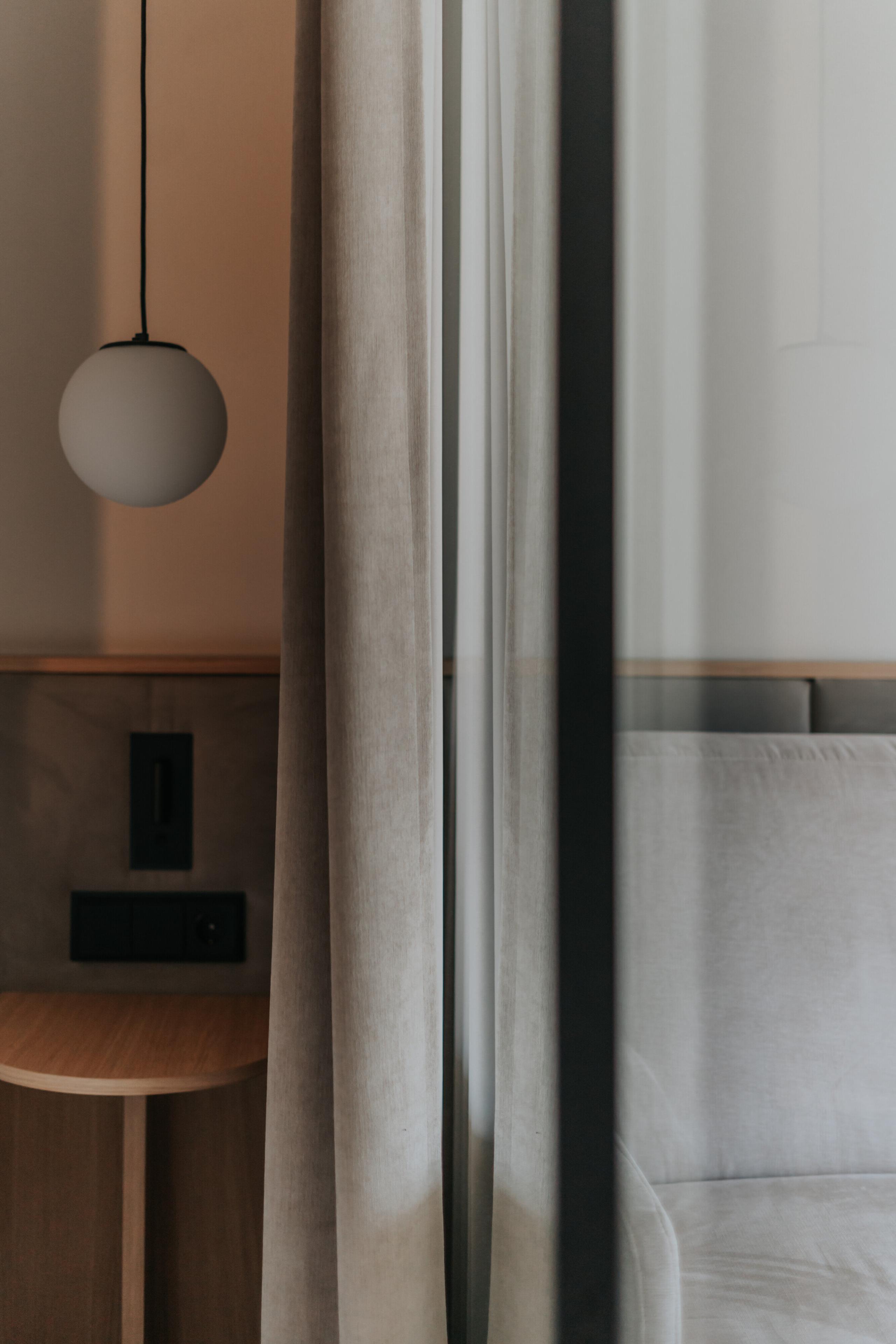 Getrennter Wohn- und Schlafraum durch eine Glasschiebetür mit Verdunkelungsvorhang
