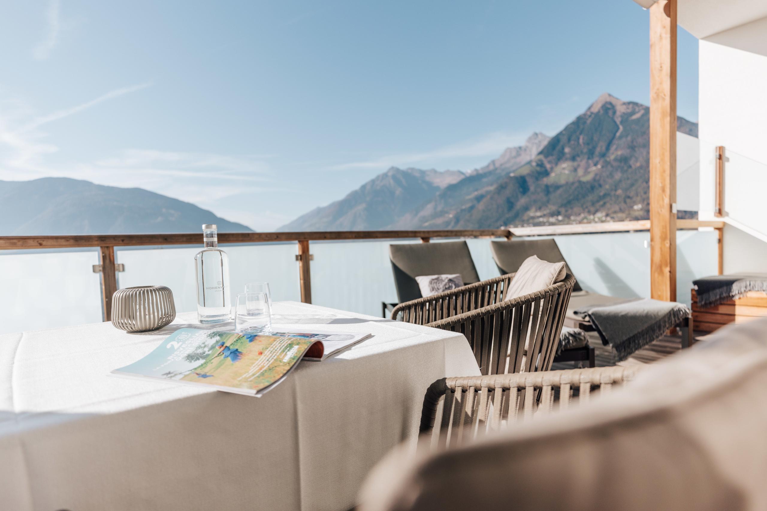 Luftig, hell und weitläufig präsentiert sich diese außergewöhnliche Suite im vierten Stock des Hauses Traube. Große Glasflächen öffnen den Blick über das Meraner Land und lassen Innen und Außen fließend ineinander übergehen. Der weitläufige Balkon mit Open-Air-Badewanne, Daybed, Sonnenliege und Sitzgruppe wird zum privaten Rückzugsort unter freiem Himmel. Zwei separate Schlafzimmer mit jeweils eigenem Badezimmer bieten Rückzug und Privatsphäre für die ganze Familie. Der großzügige Wohnbereich mit Sofalandschaft, Elektrokamin und stilvoller Hängeschaukel schafft Raum zum Entspannen und Verweilen. Die innovativen Klima-Zimmerdecken fügen sich unauffällig in das Raumkonzept ein und sorgen das ganze Jahr über für ein angenehm ausgeglichenes Wohngefühl.