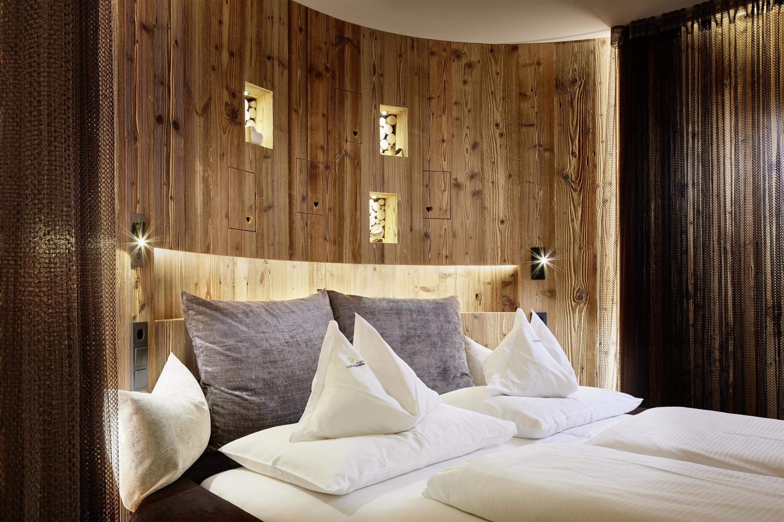 Relax-Kuschelsuite im Alpine Lifestyle mit rundem Luxusbett, privater Outdoor Jacuzzi, Romantic Fire Kamin, Relaxsesseln, Weinschrank, begehbarem Schrank, Schaukelliegen, Espressomaschine & Teeset, Lady-Beauty-Desk, exklusives Badezimmer mit Lichtspielen & Erlebnisdusche für Zwei, getrenntes WC, großer Balkon oder Loggia zum Wellnessgarten mit Bachlauf.