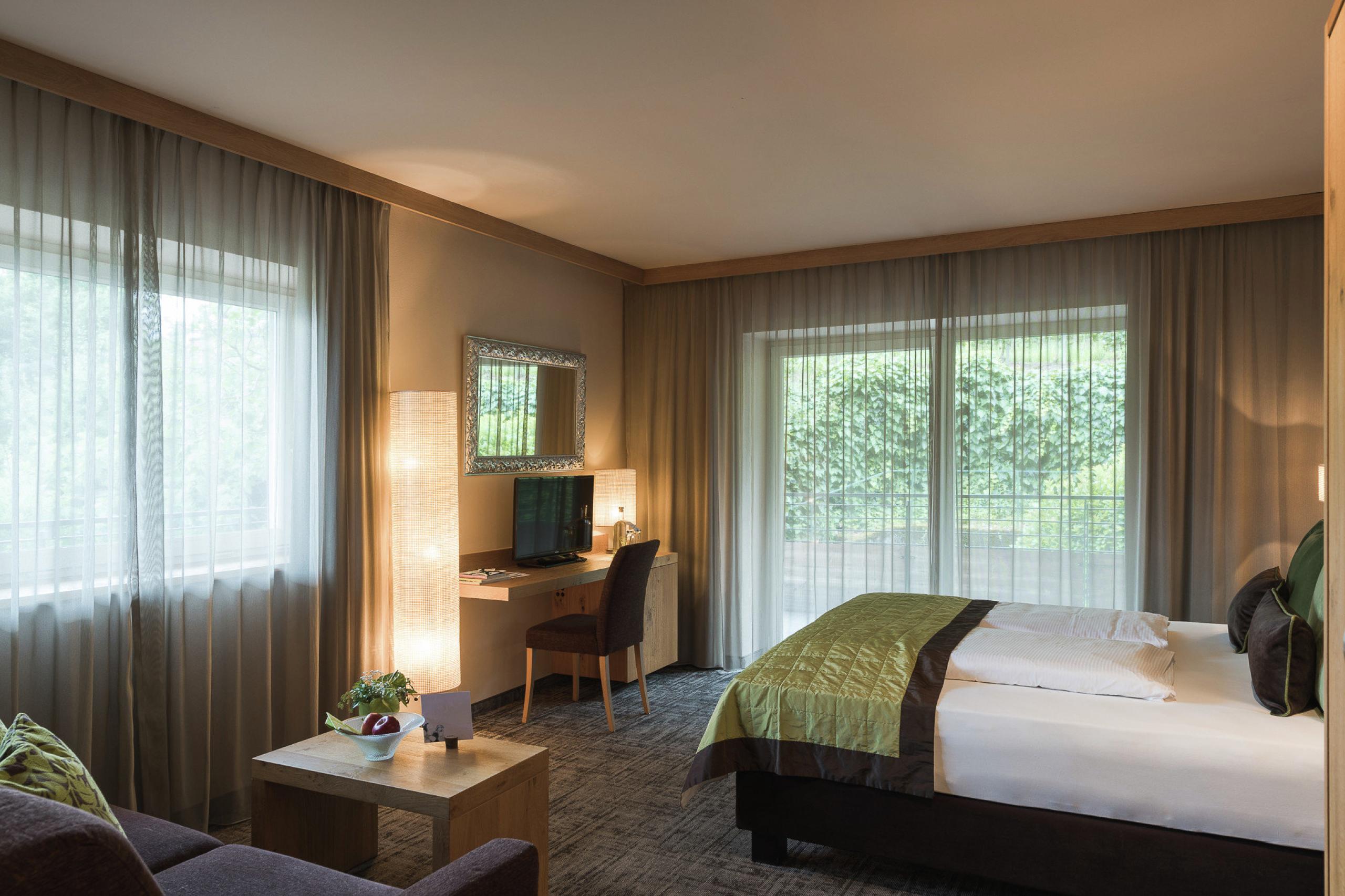 Das 35 m2 Doppelzimmer verfügt über einen großzügigen Schlafbereich mit Wohnecke & ausziehbarer Schlafcouch, Sisal-Teppichboden, Schreibtisch, Boxspringbett mit Health Sleep System, geschlossenes, separates Badezimmer mit Komfort-Badewanne und integrierter Dusche, Waschtisch, WC und Bidet.