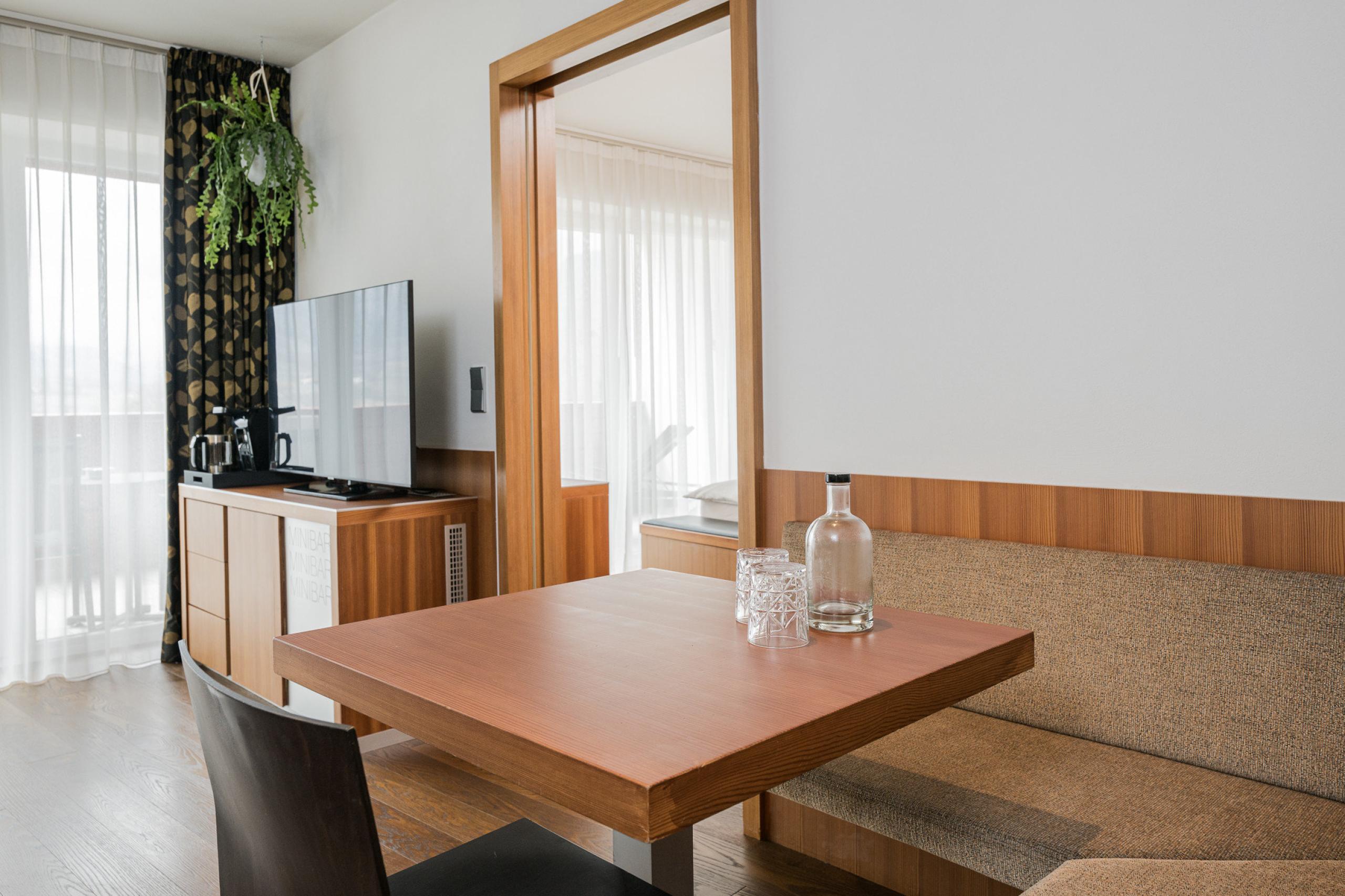 Reschensuite (48 m², 2-4 Personen): Juniorsuite, Schlafzimmer und Wohnraum durch Tür abtrennbar, Sofa und Sitzecke, Holzboden, Bad mit Badewanne, Dusche, Bidet, Flat- TV, gratis W-Lan, Minibar, Safe, Süd-Westbalkon, Garage
