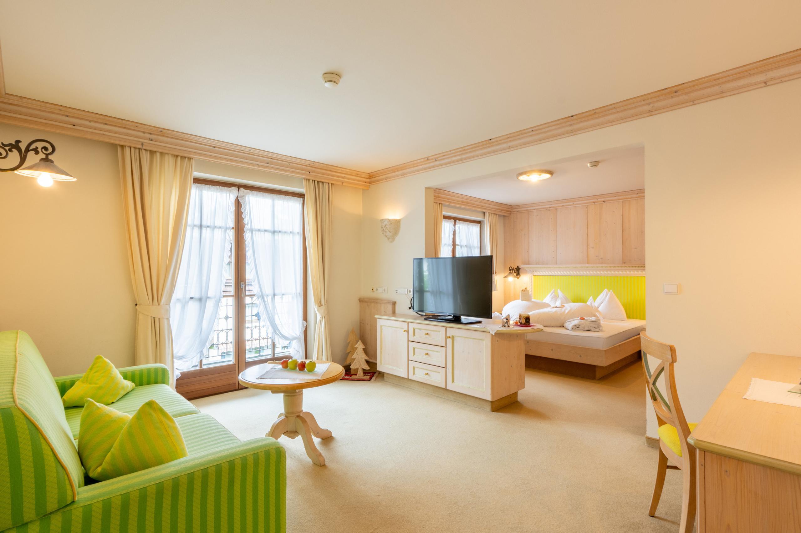 Dieses geräumige Zimmer ist in hellem Fichtenholz mit hellgrünen und gelben Stoffen eingerichtet, Bad mit Badewanne und Dusche, getrenntem WC mit Bidet, Wohnecke mit Sat-LCD TV, Internetanschluss und Balkon ausgestattet.
