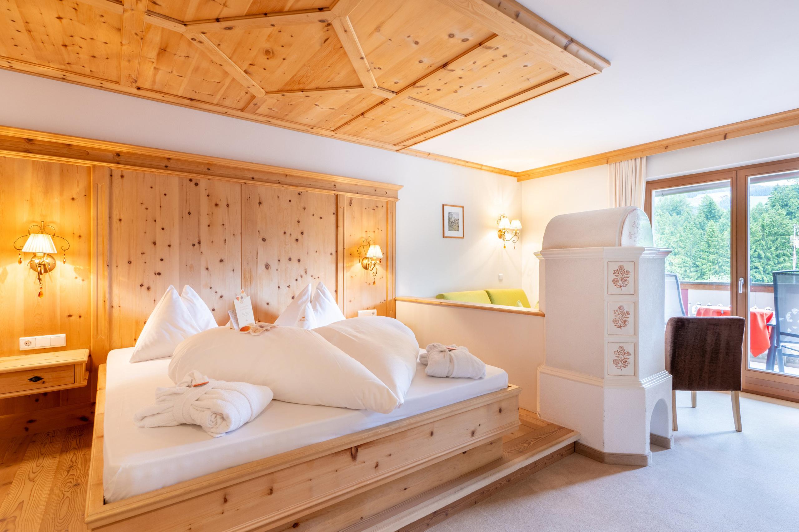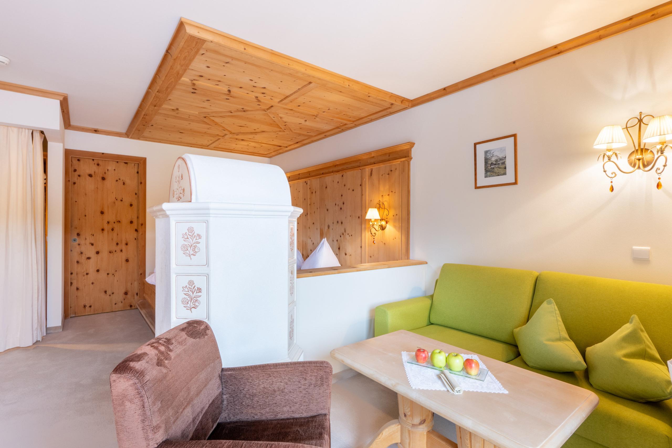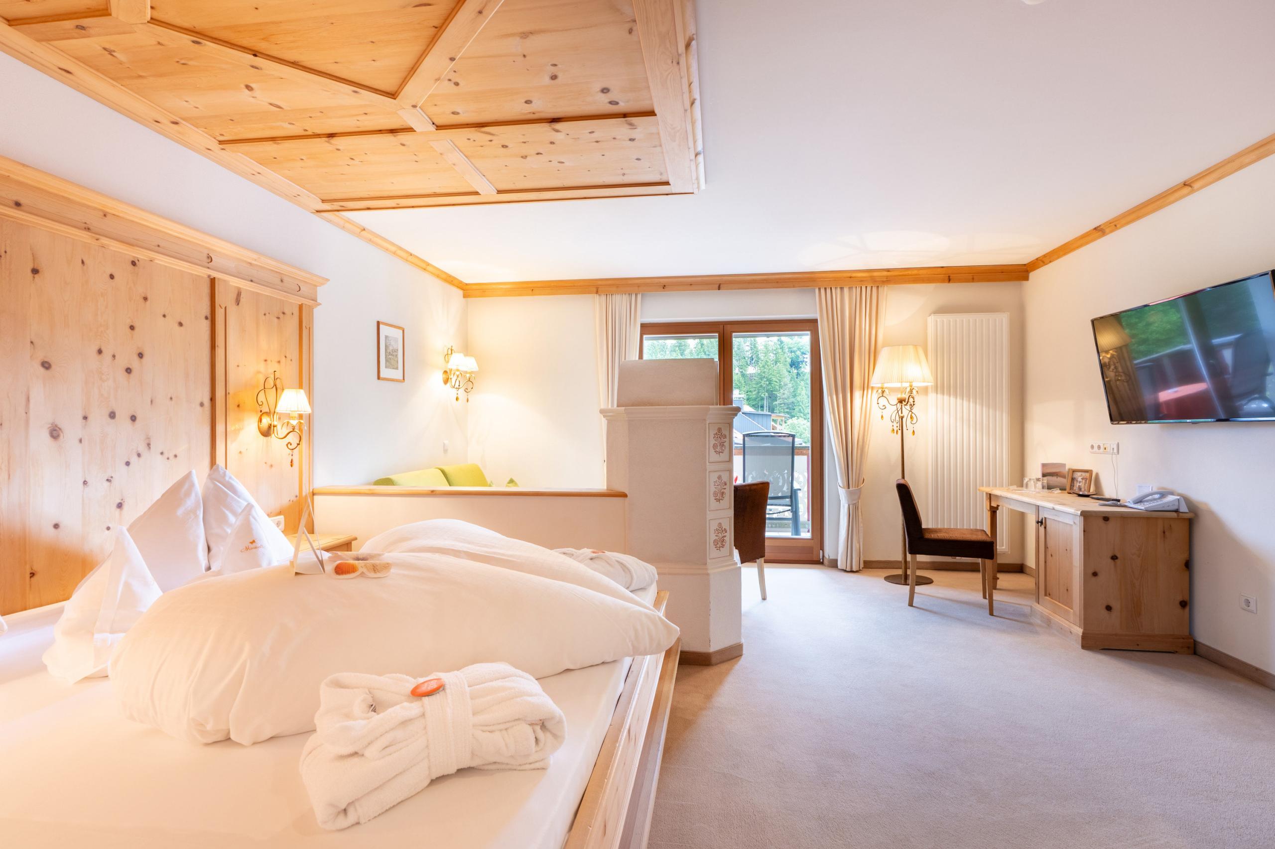 Dieses einladende Zimmer eingerichtet in Zirbenholz, besitzt ein Tageslichtbad mit Dusche, WC und Bidet, Wohnecke und Sat-LCD TV, Internetanschluss und Balkon.