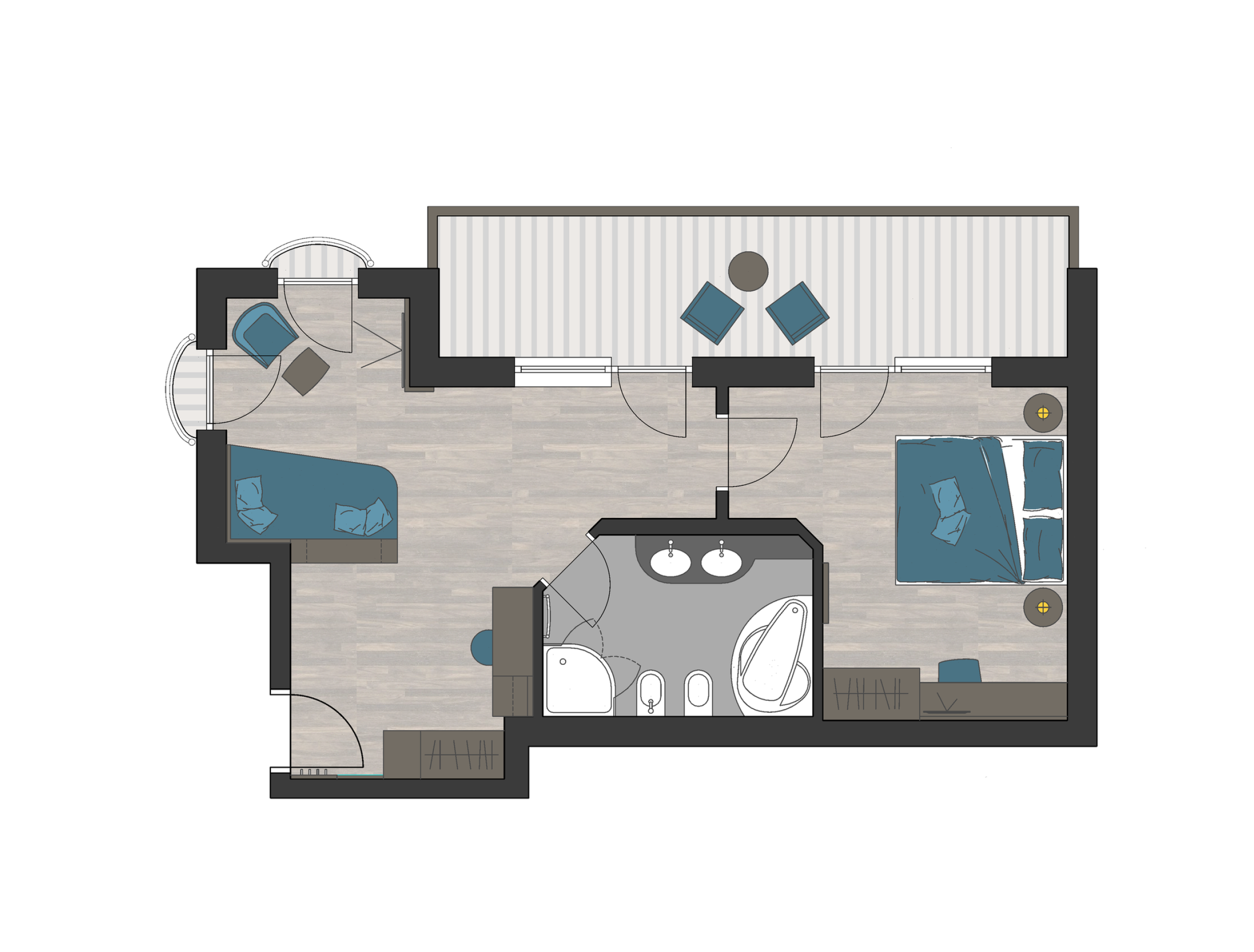 Luxuriöse Suite mit Schlaf- und separatem Wohnbereich und Balkon mit Abendsonne. Bad mit Badewanne und Dusche, WC, Doppelwaschtisch, Bidet, Kosmetikspiegel und Föhn, Wellnesstasche mit Bademantel und Badeschlappen. Außerdem Safe, SAT-TV, WI-FI und Minibar sowie Wanderrucksack