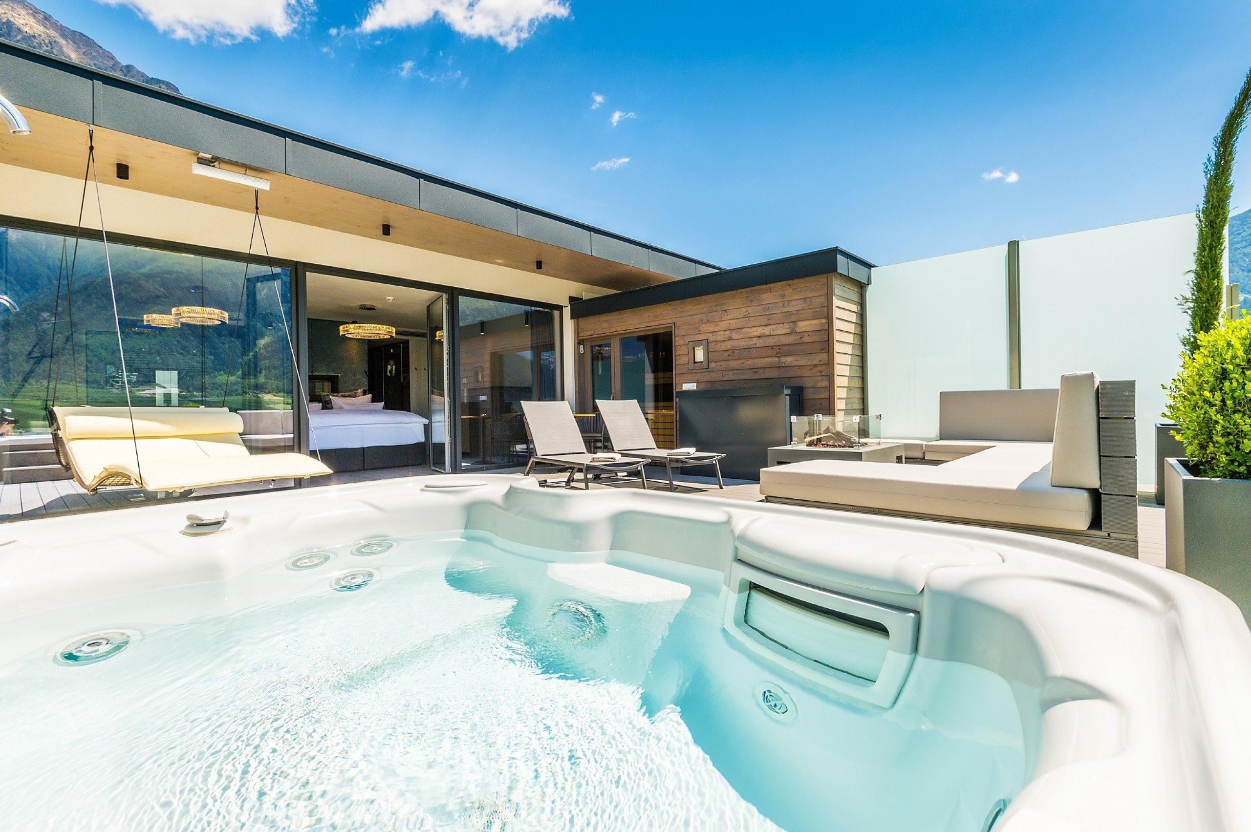 101m² inklusive 56m² Outdoor-Penthouse -Terrasse mit Panoramablick, Whirlpool, privater Butler Service, offene Wohn-Schlaflounge mit Romantic Fire, Luxus-Boxspringbett (Kingsize) mit Sleep-Fit-Health-System 200x210cm, Komfort-Profi-Schranksystem, 2 Relax-Design-Chairs, 55" Smart-TV mit Google Chromecast, Koffer-Designbar mit Wein-, Nespresso- & Teedesk, Badelounge mit Design-Spiegel aus Halbedelstein mit Lady-Beauty-Desk, Erlebnisdusche für 2, Outdoor-Penthouse-Terrasse mit privater Atmosphäre, Whirlpool de luxe mit Hygienic-Luxury-System, Finnische Außensauna mit Erlebnisdusche für 2 & Schaukelliege für 2, Feuerstelle "Sky Star"mit Kuschel-Lounge, Outdoor Cinema, bequeme Sitz- und Essmöbel, Duftkräuter, Wärmestrahler und Laterne, keine Tiere. In der DolceVita Lodge.