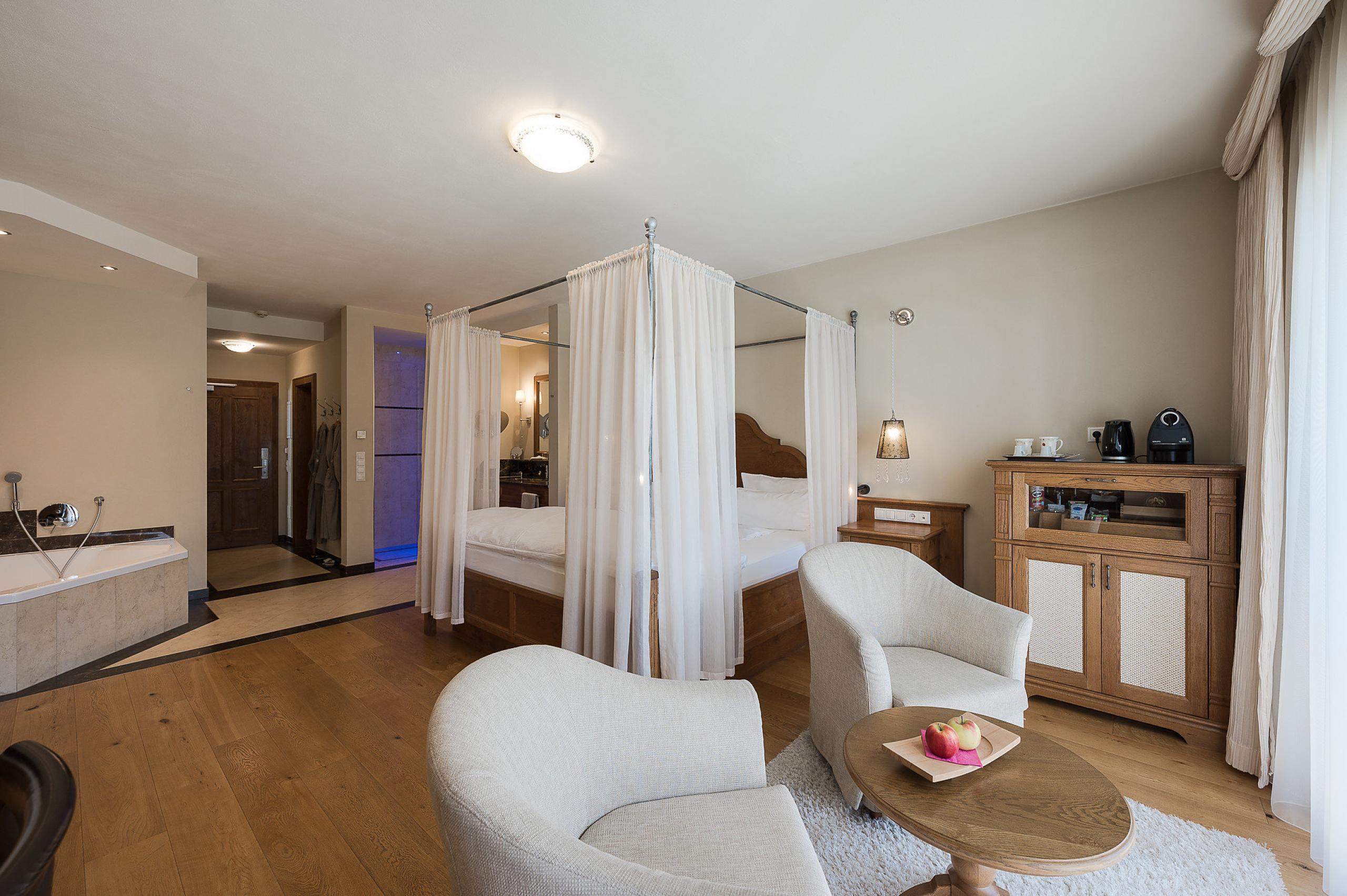 48m² inklusive 6m² Südbalkon mit Panoramablick, klassisch, elegante Naturholzausstattung, Luxus-Himmelbett „Romantic Dream“ (Kingsize) mit Sleep-Fit-Health-System 200x210cm, begehbarer Schrankraum, Schreib- und Arbeitstisch, Romantic-Fire-Kamin, 55" Smart-TV mit Google Chromecast, Small-Bar mit Wein-, Nespresso- & Teedesk,großzügiges Edel-Badezimmer mit Relax-Dusche für 2, im Raum offene Romantik-Badewanne, Nobel-Waschtisch , WC und Bidet getrennt, Südbalkon und bequeme Relaxmöbel, keine Tiere. Im Sonnenschlössl.