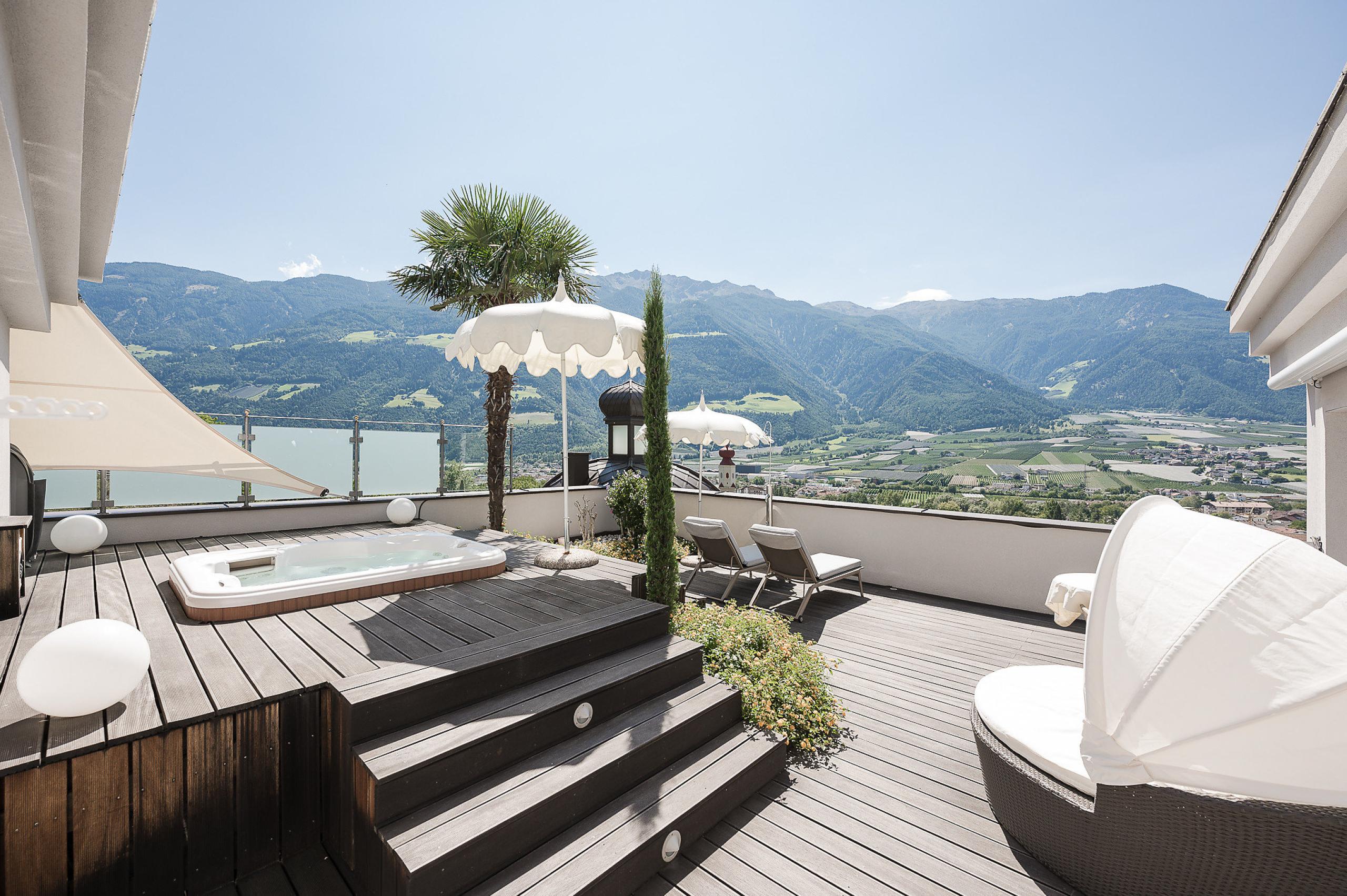 95m² inklusive 50m² Outdoor Living Room mit Panoramablick, klassisch, elegante Naturholzausstattung, kuschelige Suite mit eigenem Private-Outdoor-Whirlpool und Sauna, Luxus-Himmelbett „Romantic Dream” (Kingsize) mit Sleep-Fit-Health-System 210 cm lang, Komfort- Schranksystem, Schreib- und Arbeitstisch, 55" Smart-TV mit Google Chromecast, Small-Bar mit Wein-, Nespresso- & Teedesk, großzügiges Edel-Badezimmer mit Relax-Dusche für 2, Romantik-Badewanne, Nobel-Waschtisch, WC und Bidet getrennt, Outdoor Living Room-SPA mit privater Atmosphäre, Südlage mit Blick auf die Bergwelt Südtirols, keine Tiere. Im Sonnenschlössl.