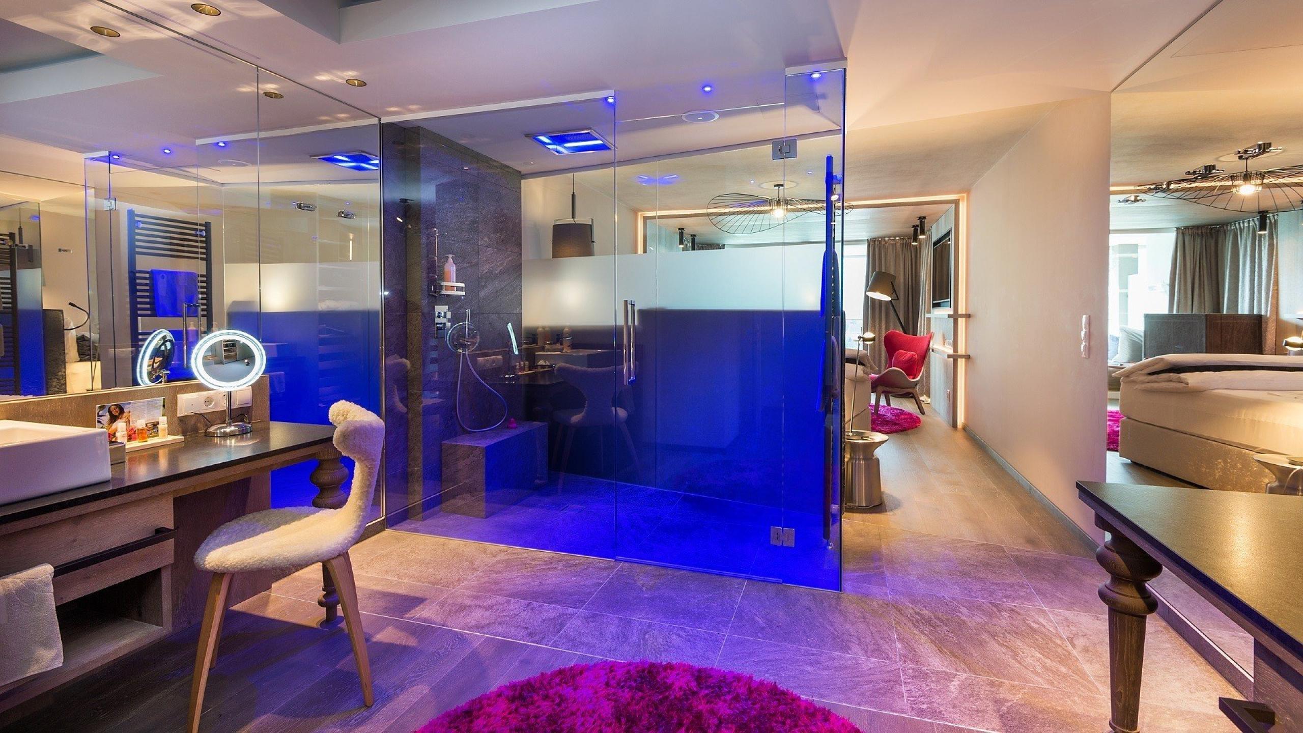56m² inklusive 12m² Outdoor Living Room (Loggia) mit Panoramablick, Luxus-Boxspringbett (Kingsize) mit Sleep-Fit-Health-System 200x210cm, Komfort-Profi-Schranksystem, 2 Relax-Design-Chairs, 55" Smart-TV mit Google Chromecast, Koffer-Designbar mit Wein-, Nespresso- & Teedesk, Design-Badezimmer mit Erlebnisdusche mit Licht- & Sound-System, Beauty-Desk, getrennter Waschtisch, WC und Bidet getrennt, Outdoor Living Room (Loggia im Freien) mit Day Bed (zum Übernachten im Freien), bequeme Sitzmöbel, Duftkräuter, Wärmestrahler und Laterne, keine Tiere. In der DolceVita Lodge.