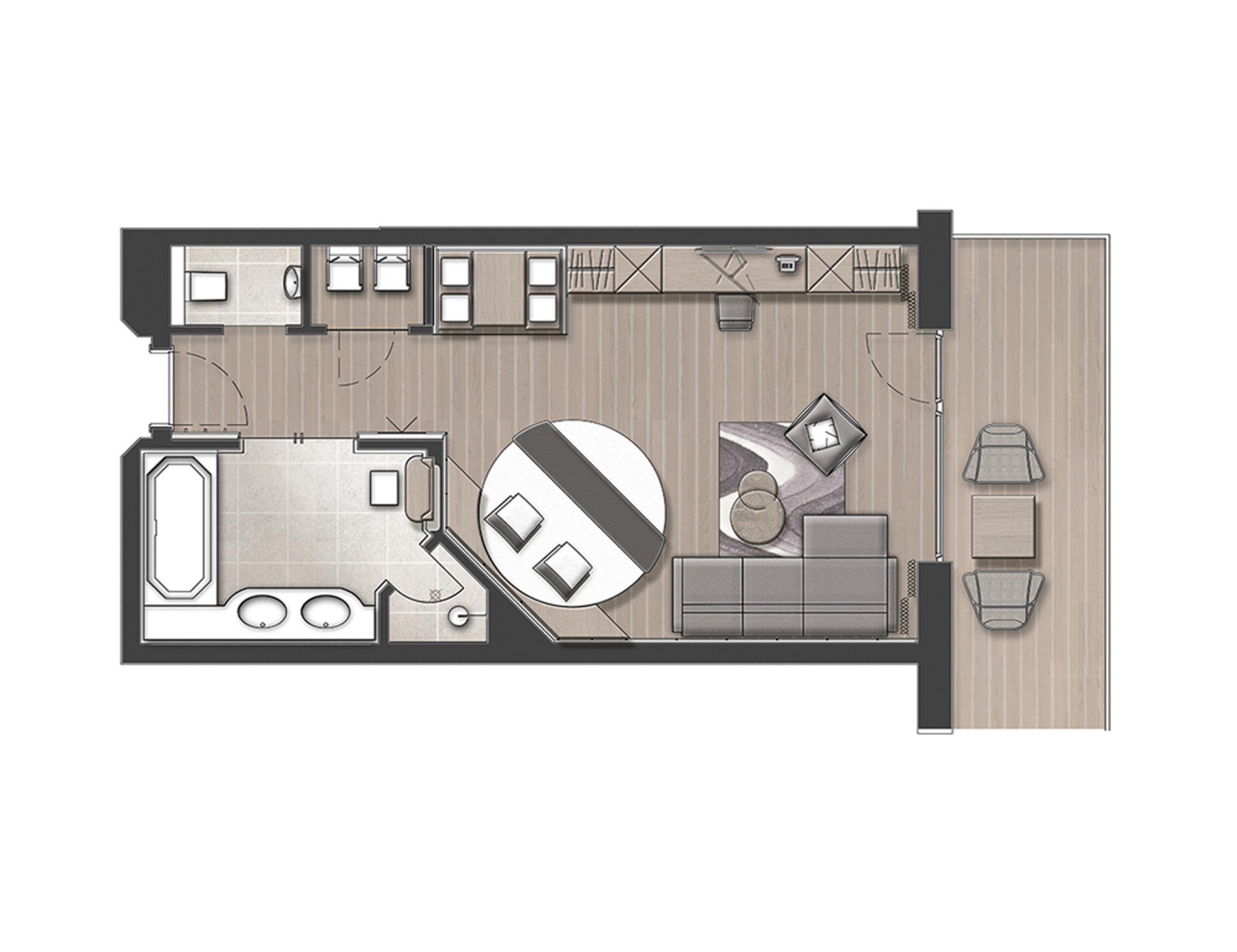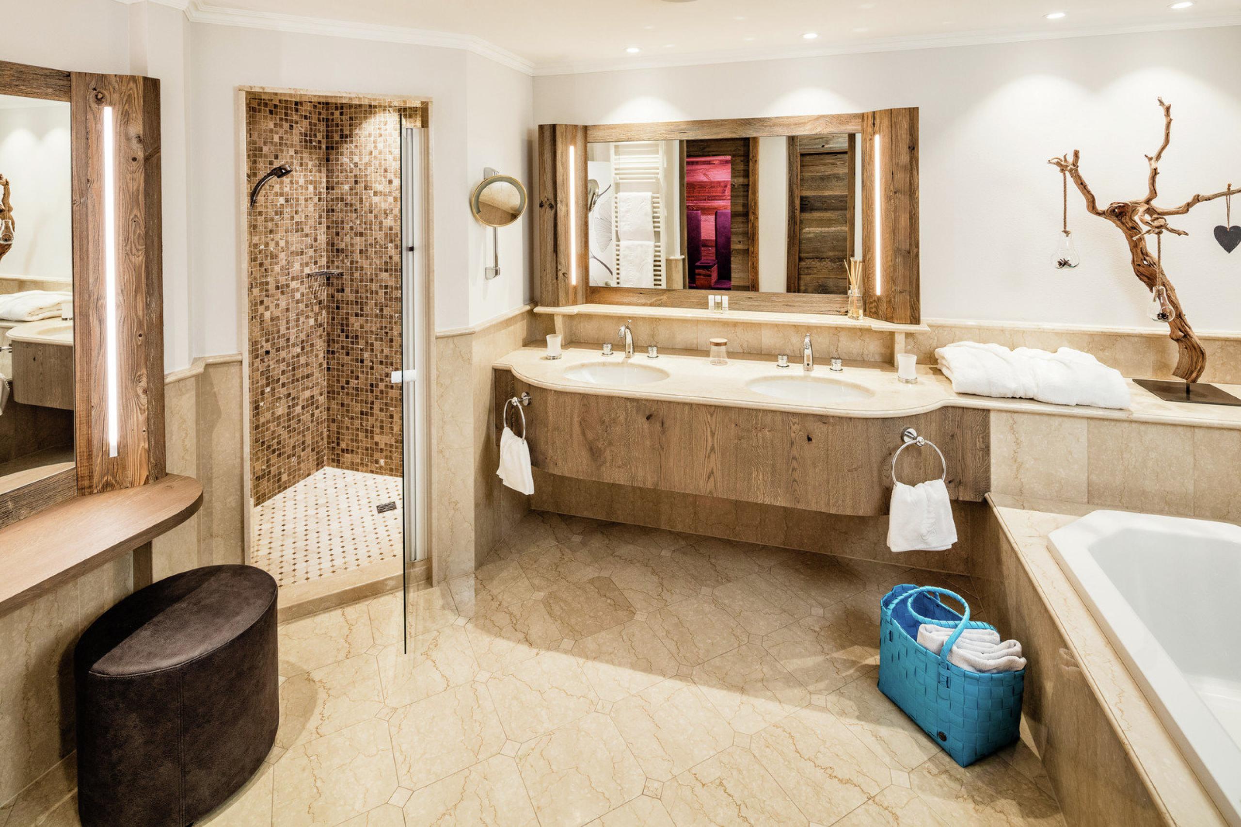 Luxuriöses Wohn-Schlafzimmer mit ca. 50 m², Naturholzboden, rundes Doppelbett, Relax-Infrarotkabine (medizinische Tiefenwärme), orginal Südtiroler Stube, Nespresso-Kaffemaschine, großes Marmor-Badezimmer mit separater Dusche und Badewanne, Doppelwaschbecken, abgetrenntes Dusch-WC (WC mit Bidetaufsatz), eigene Schminkecke, Fön, Badetasche mit Badetuch und kuscheligem Bademantel, Kühlbox, Radio, Safe, Arbeitstisch, gemütliche Couchecke, einen Flat-TV, Telefon, Lift, W-Lan, reservierter Garagenstellplatz und großer Balkon zur Südseite.