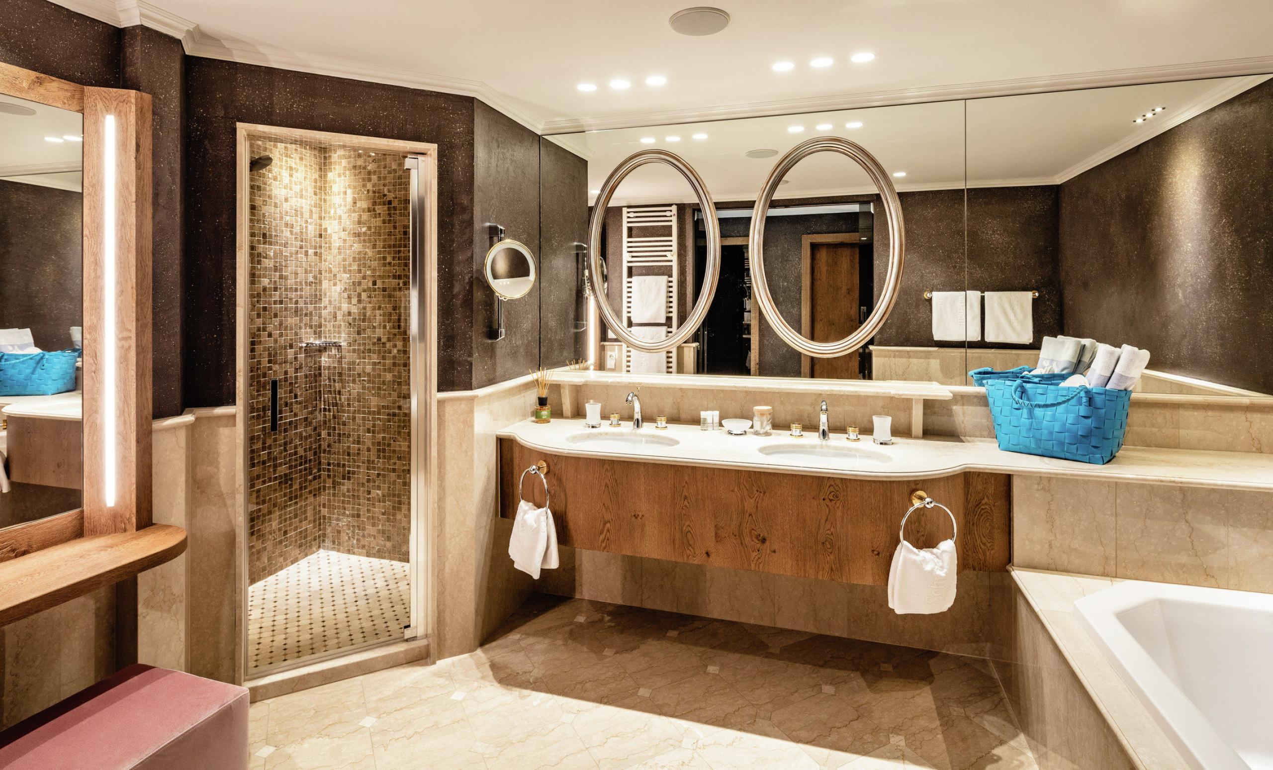 Luxuriöses Wohn-Schlafzimmer mit ca. 50 m², Naturholzboden, rundes Doppelbett, Relax-Infrarotkabine (medizinische Tiefenwärme), gemütliche Couchecke, romantisches Effektfeuer, Nespresso-Kaffeemaschine, großes Marmor-Badezimmer mit separater Dusche und Badewanne, Doppelwaschbecken, abgetrenntes Dusch-WC (WC mit Bidetaufsatz), eigene Schminkecke, Fön, Badetasche mit Badetuch und kuscheligem Bademantel, Kühlbox, Radio, Safe, Arbeitstisch, Flat-TV, Telefon, Lift, W-Lan, reservierter Garagenstellplatz und großer Balkon zur Südseite.