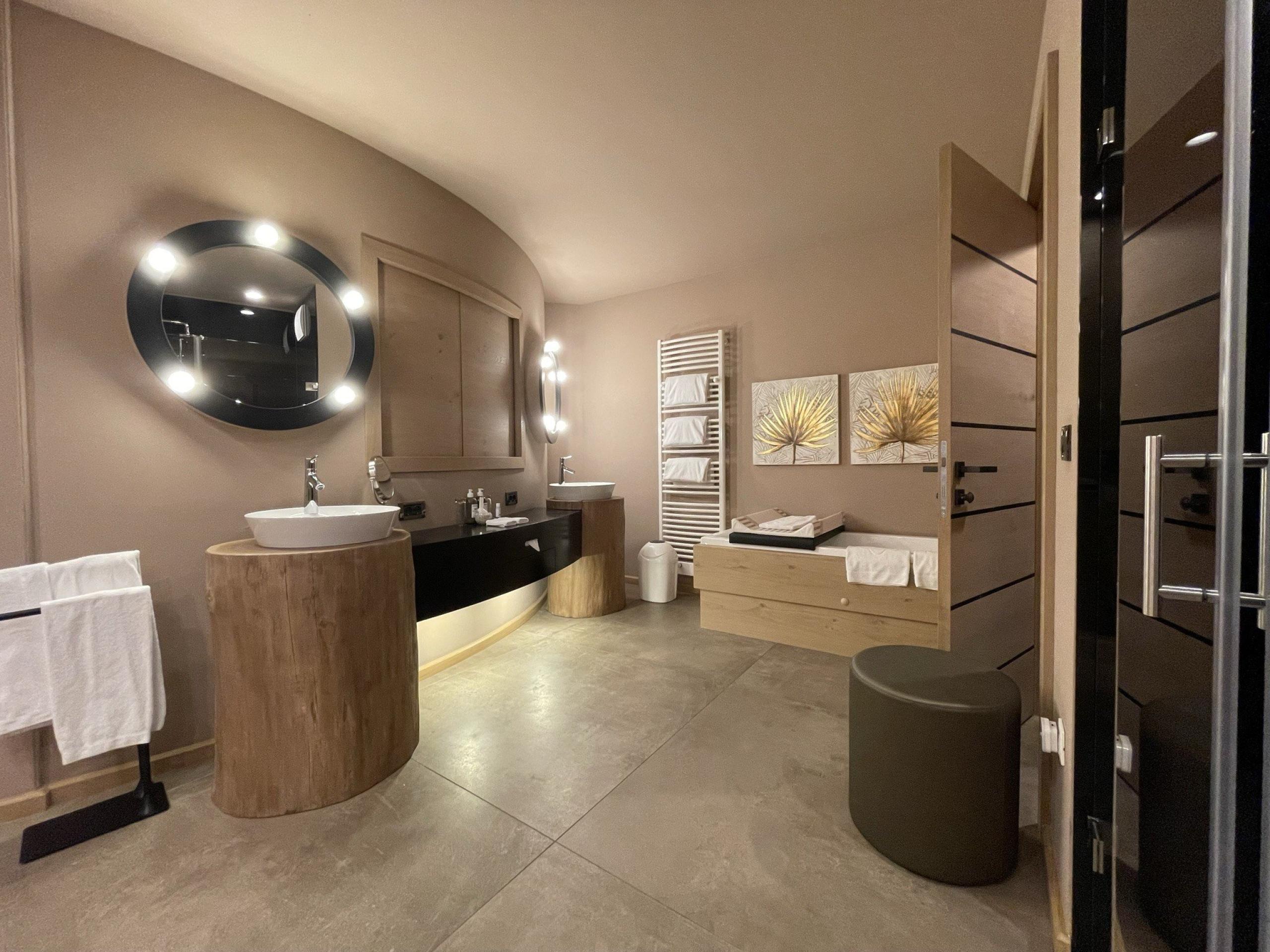 Suite mit 55 m² & Südbalkon mit Sicht in den Garten, begehbarer Schrank, Klimaanlage, TV, Minibar, Badewanne & Dusche mit Regenfall, Bidet, WC getrennt
