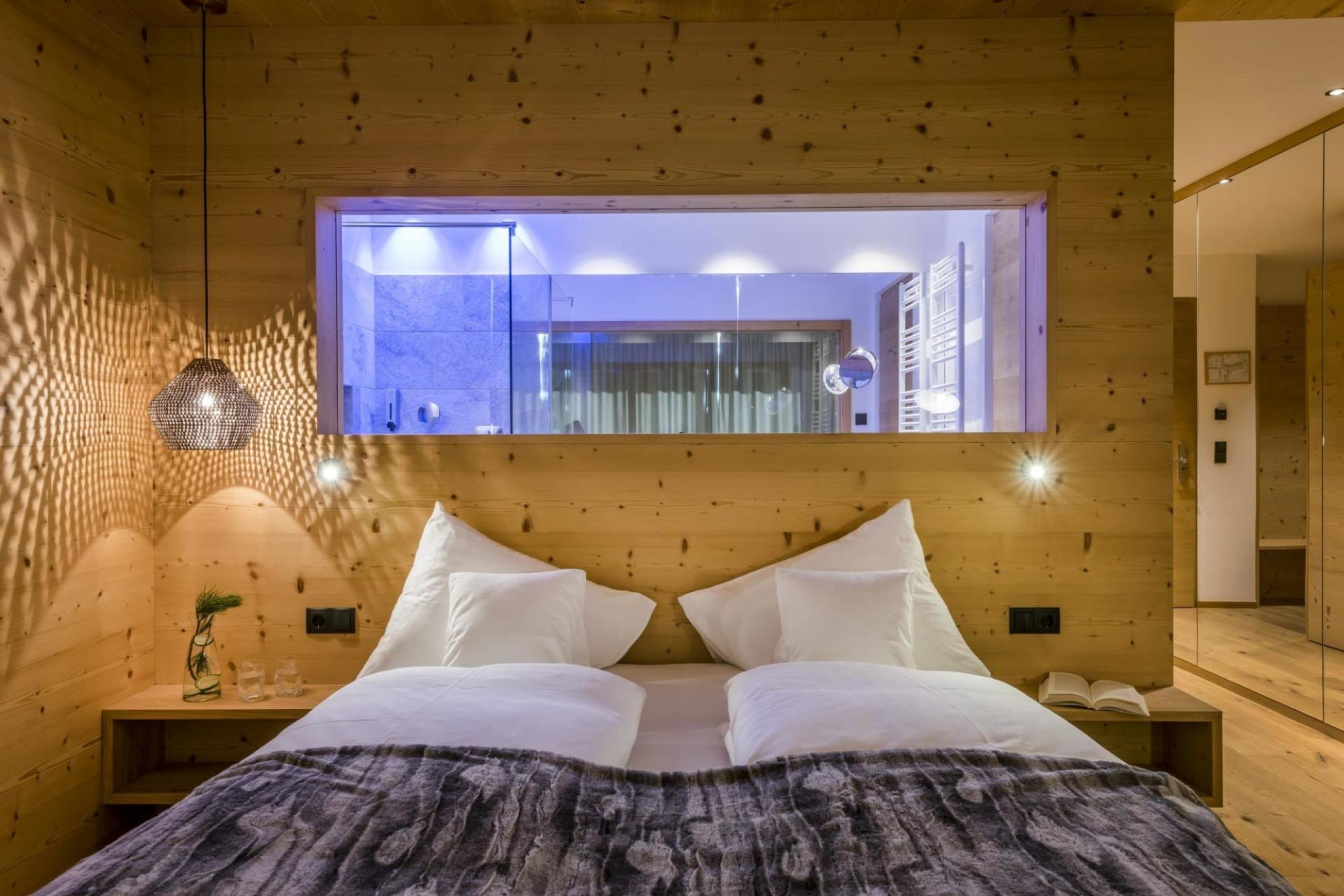 Stilvolle Juniorsuite mit großzügiger Südterrasse, Relax-Liegen und Dolomitenblick. Naturmaterialien, Naturholzboden. Doppelbett, Wohnbereich mit Couch. Bad mit Doppelwaschbecken, Dusche und Tageslicht, WC und Bidet separat.
