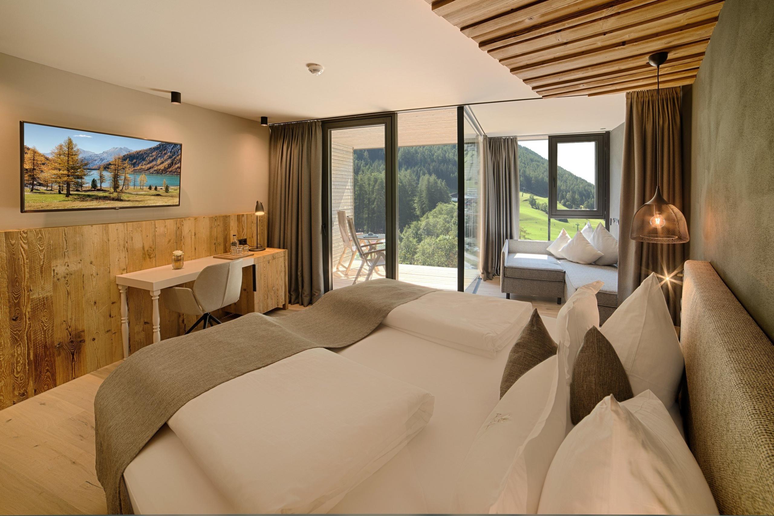 Experience Alpine cosiness in our luxurious rooms and suites, where eco-friendly architecture blends seamlessly with style. Local materials like pine wood, traditional loden fabric, linen, and wooden floors create a warm, inviting ambience, complemented by elegant details and modern design.