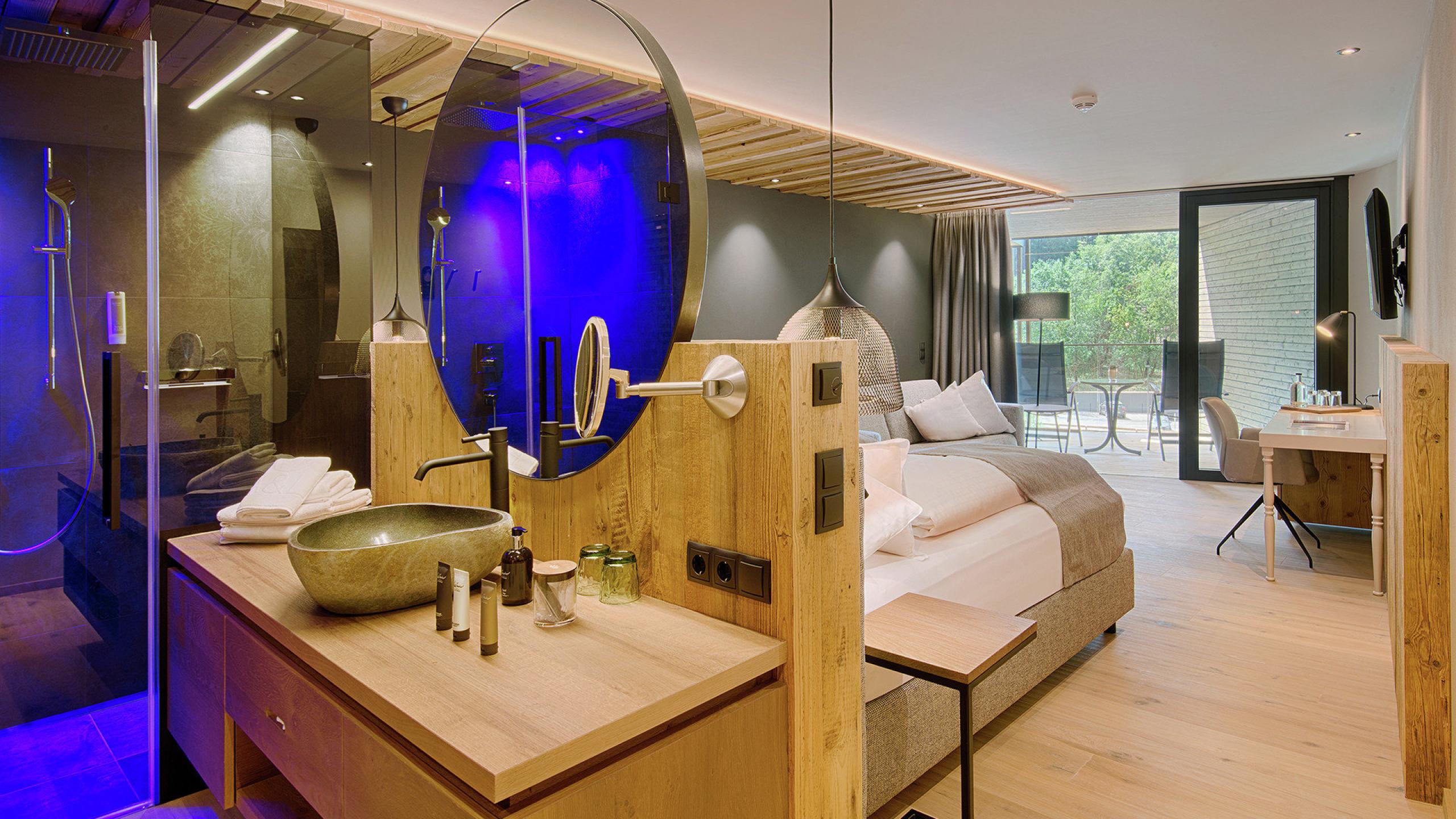 Experience Alpine cosiness in our luxurious rooms and suites, where eco-friendly architecture blends seamlessly with style. Local materials like pine wood, traditional loden fabric, linen, and wooden floors create a warm, inviting ambience, complemented by elegant details and modern design.