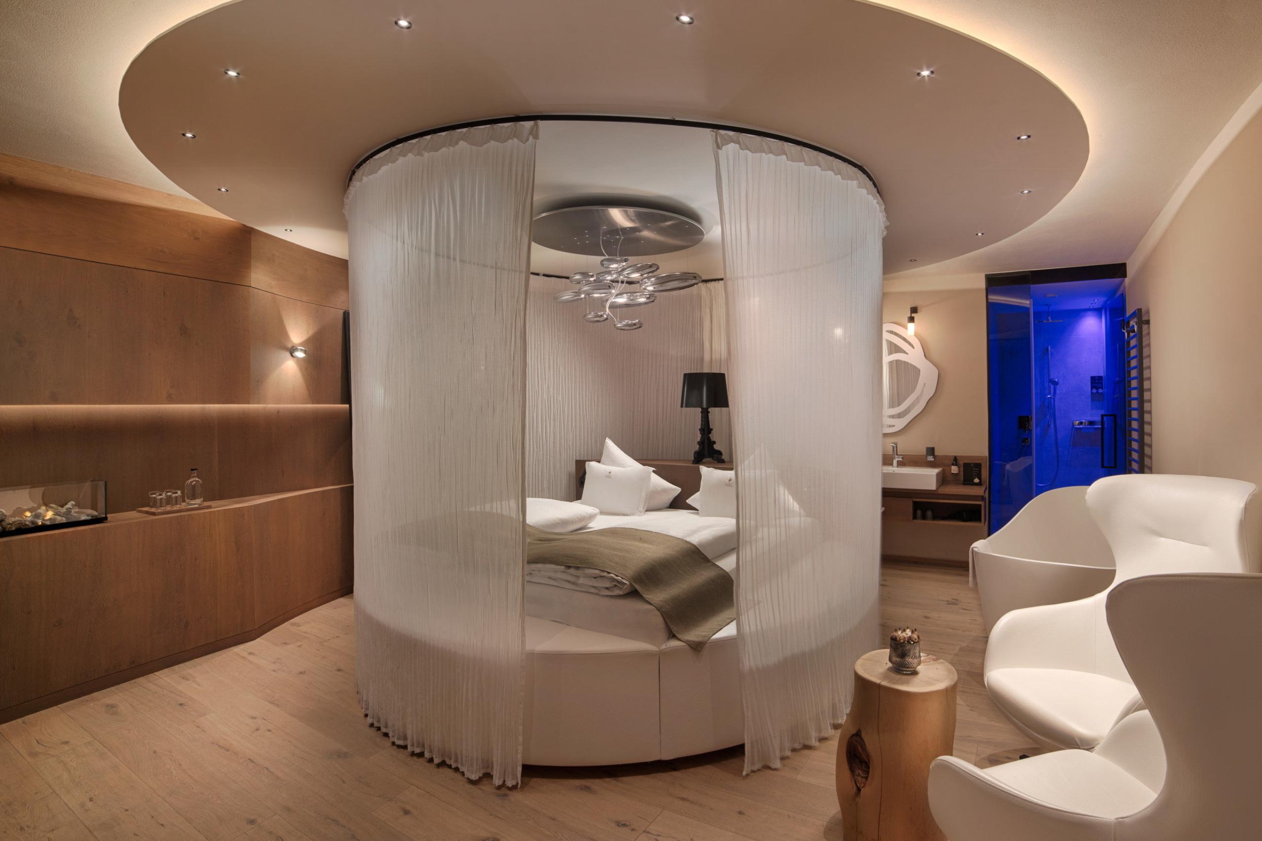 Modern suite (55 m2) with panoramic vistas, a round bed and wide window façade