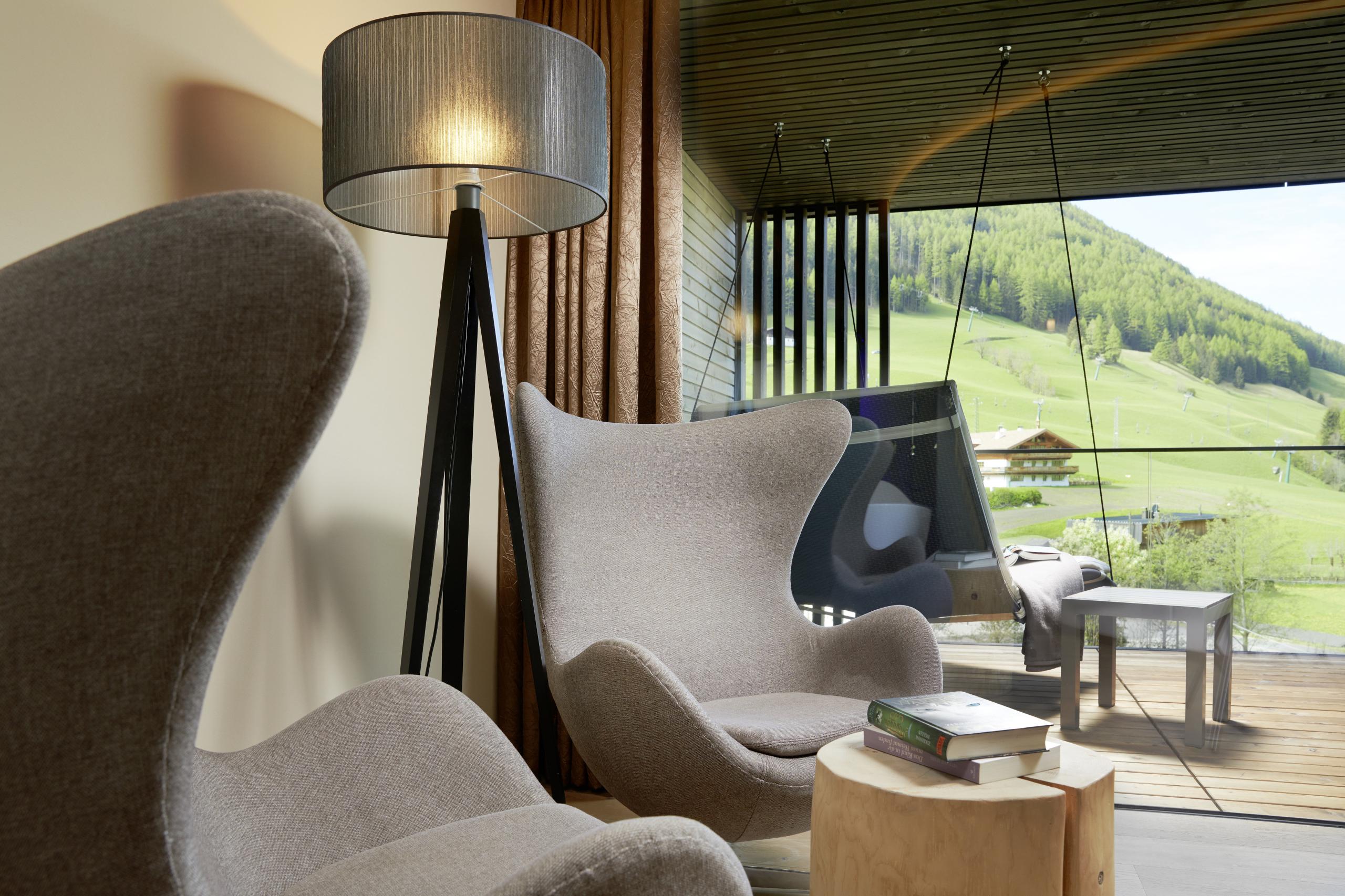 Experience Alpine cosiness in our luxurious rooms and suites, where eco-friendly architecture blends seamlessly with style. Local materials like pine wood, traditional loden fabric, linen, and wooden floors create a warm, inviting ambience, complemented by elegant details and modern design.