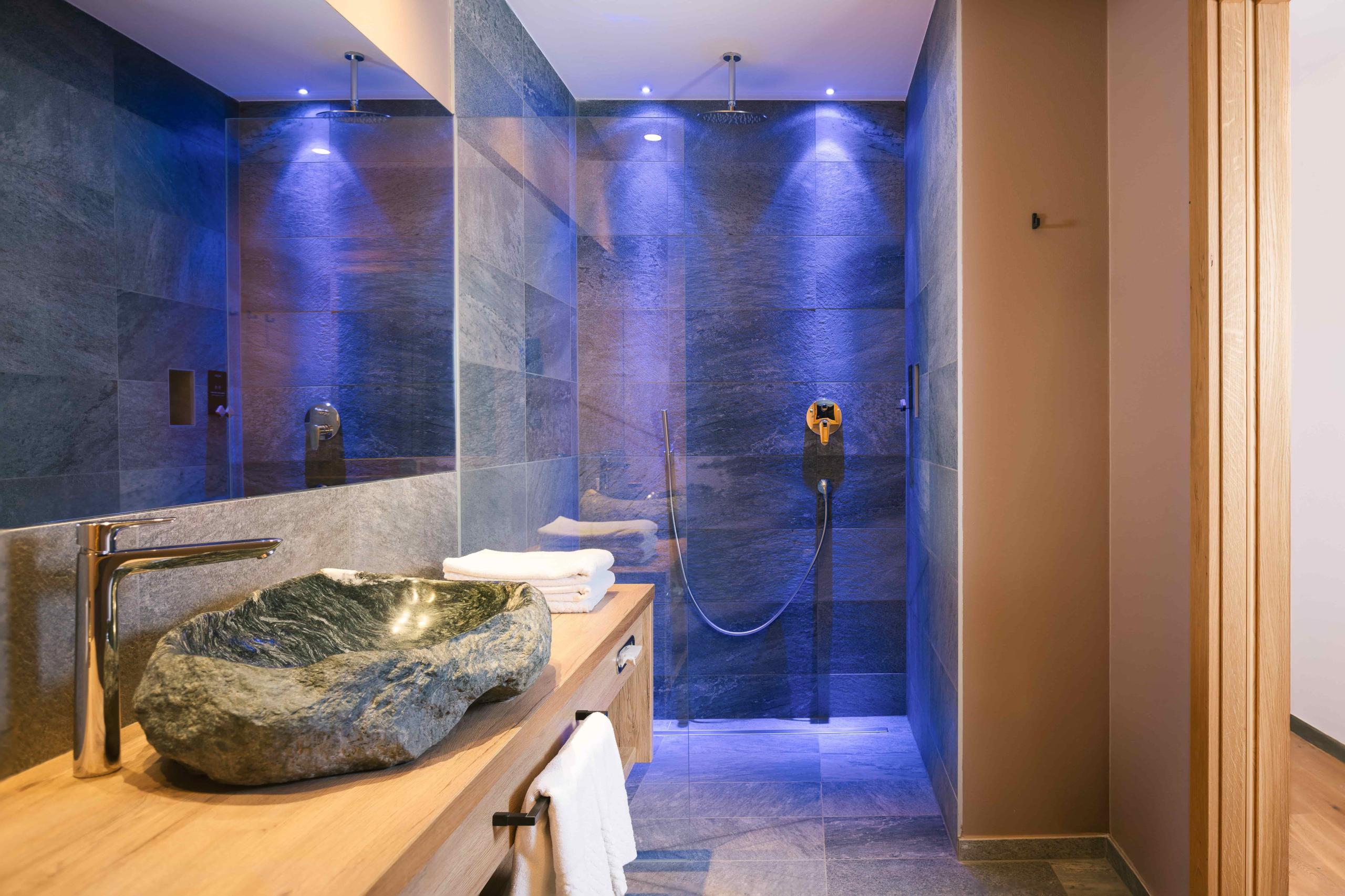 The uniqueness of the Naturzimmer Edelweiß: This room, with its modern design and furnishings of chopped oak, loden fabrics and terrastone walls, is a true nature oasis. Located on the fourth floor, it offers an even more spectacular view of the Rosengarten. The spacious bathroom with a partner shower and a sink carved from natural stone completes this extraordinary living experience.
