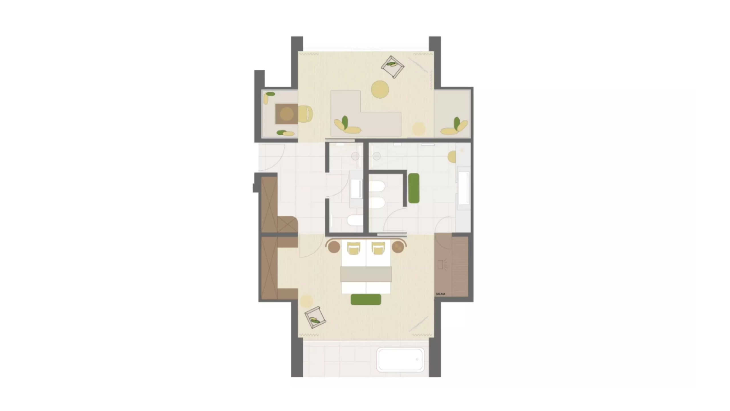 Premium suite in chalet style on the top floor with 80 m² and 20 m² balcony, natural wood furnishing and flor. Bedroom with king-size bed, separate living room with couch that converts into three separate beds if required, working table. Elegant bathroom with relaxation shower, private combined Finnish and infrared sauna, washbasin, lady make-up desk, separate WC and bidet. Second bathroom with relaxation shower, washbasin and WC. Minibar with Nespresso and tea corner, telephone, LED satellite TV, safe, free Wi-Fi. Cosy bathrobes, pool towels, slippers and backpack. Covered south-facing balcony with Jacuzzi minipool and loungers. View over the meadow, San Vigilio and the Dolomites. Garage space included. No pets allowed.