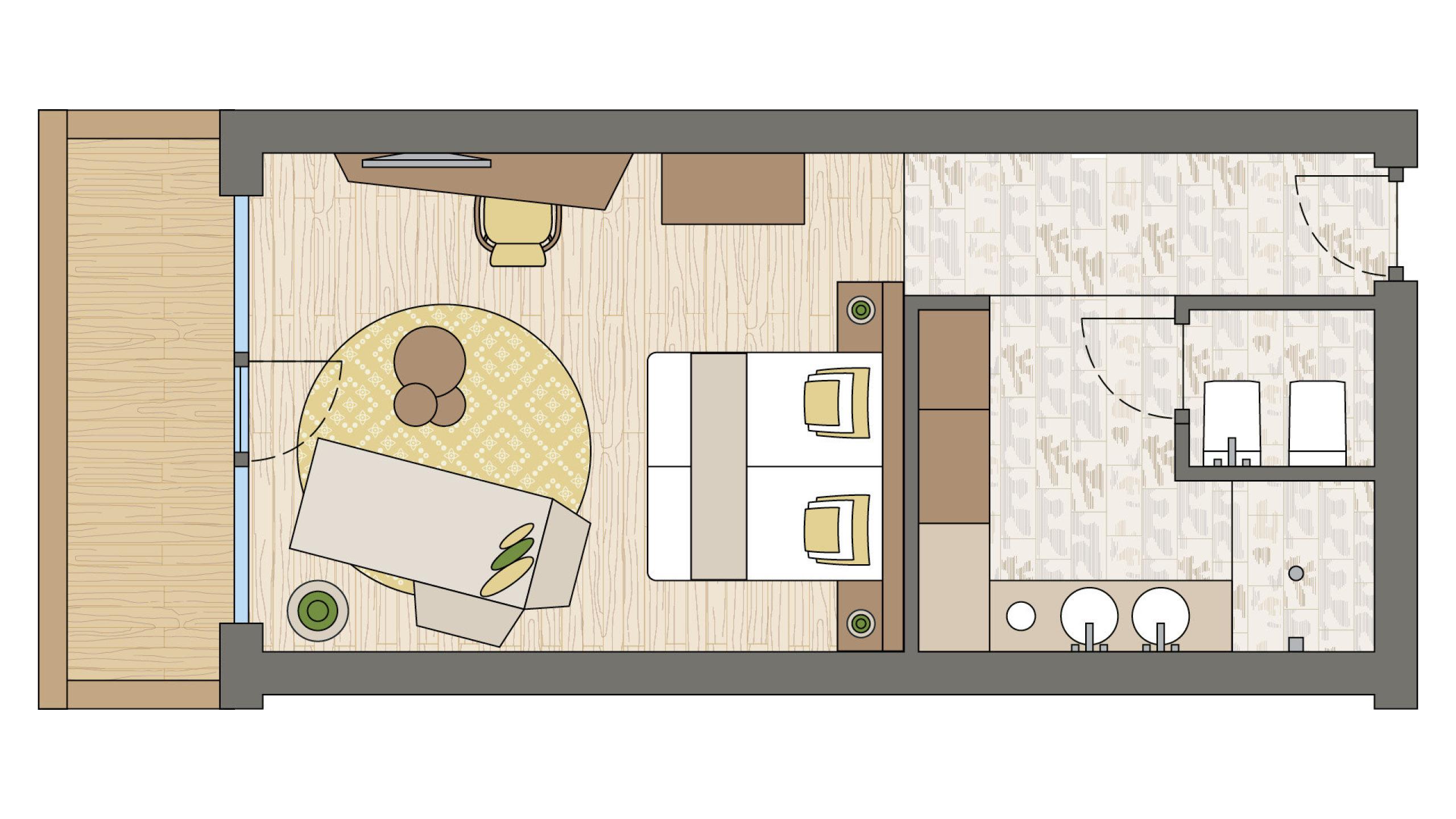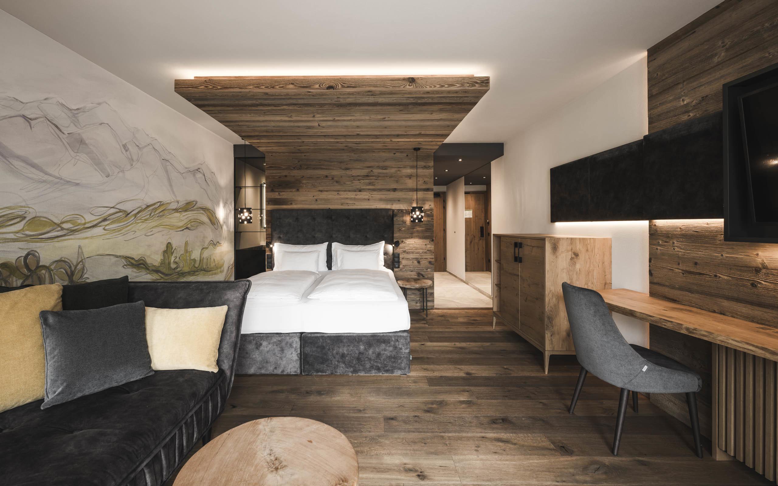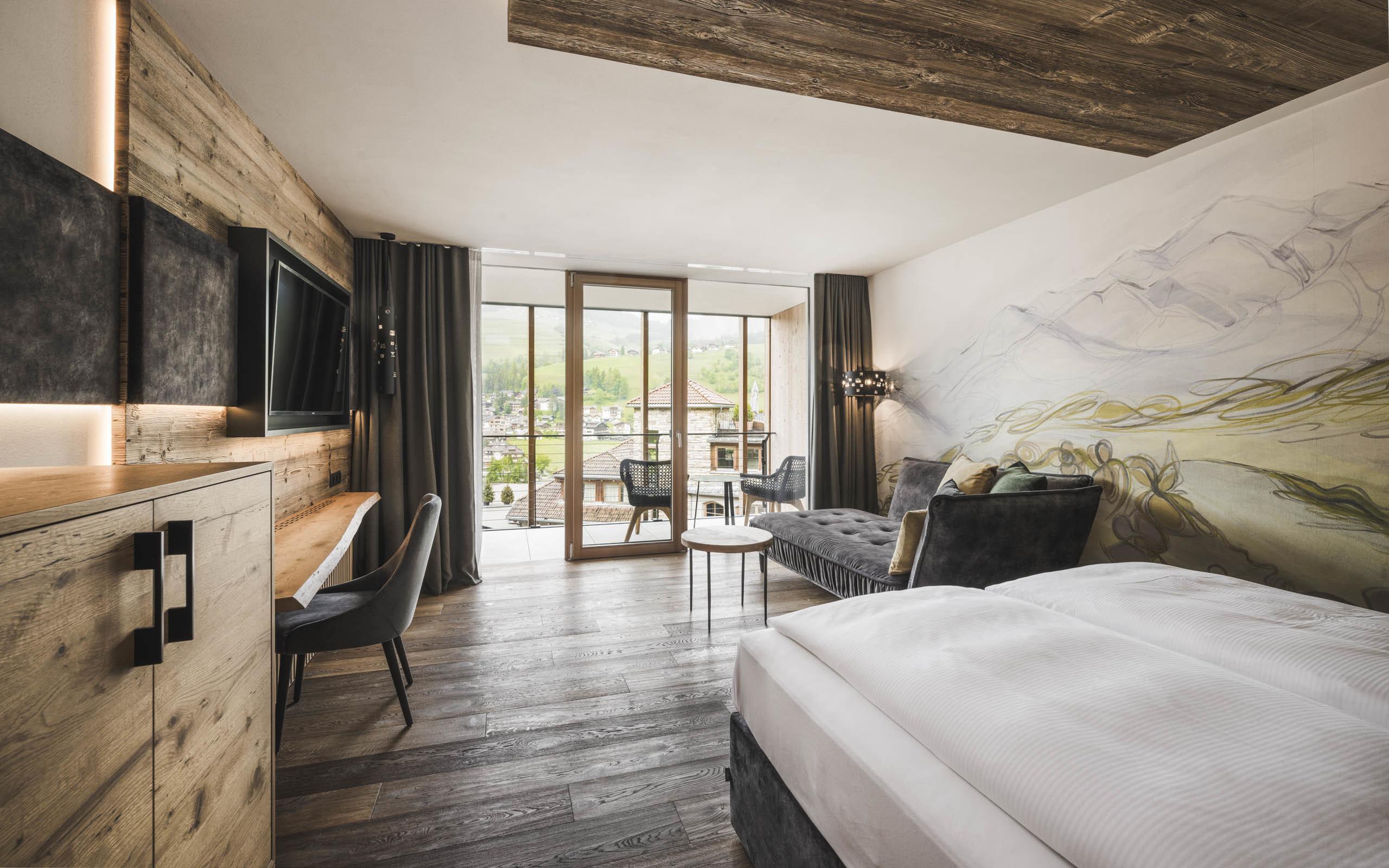 Elegant living-bedroom de luxe in chalet style with 37 m² and 7 m² balcony, natural wood furnishing and floor. King-size double bed, chaise longue, working table, living-bathroom with wardrobe, spacious relaxing shower, separate WC and bidet, double washbasin in marble, lady make-up desk. Minibar with Nespresso and tea corner, telephone, LED satellite TV, safe, free Wi-Fi. Cosy bathrobes, pool towels, slippers and backpack. Covered east balcony with panoramic view of the Dolomites. Garage space included. No pets allowed. The images serve as an example, the furniture and the floor plan may vary.