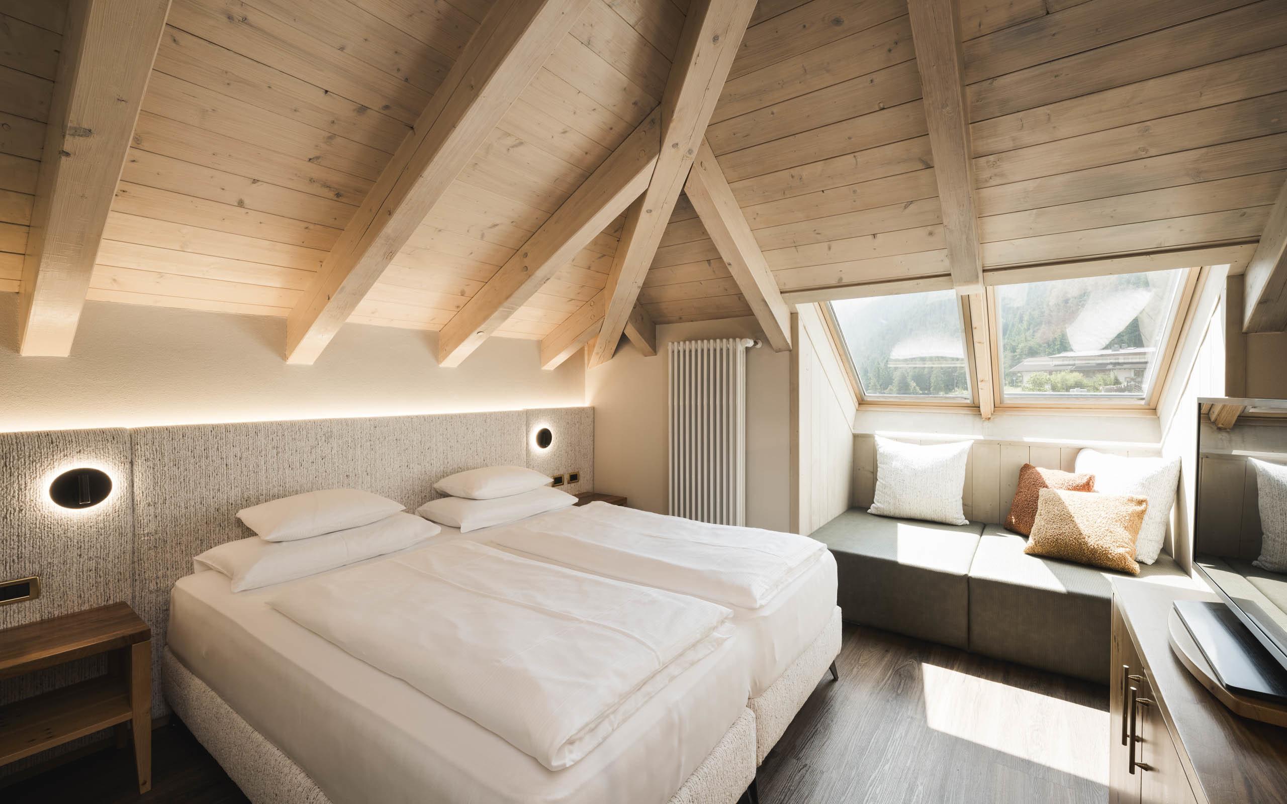 In our rooms and suites, the majesty of the mountains meets modern luxury. Enjoy an elegant yet cosy atmosphere inspired by local stone, warm woods, the soothing scent of alpine herbs, and exquisite Italian design.