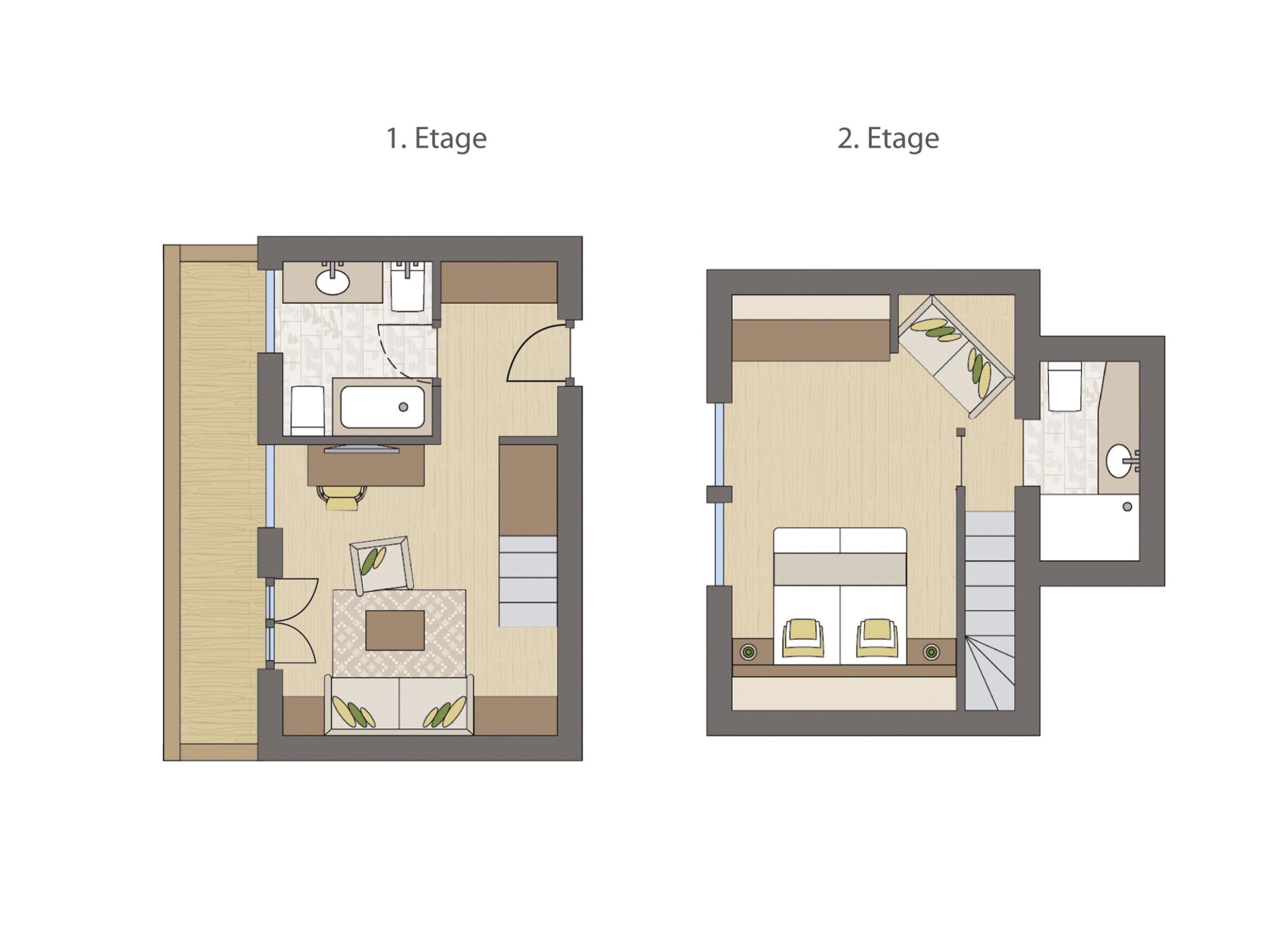 Maisonette on 2 floors in modern alpine style with 55 m², wood furnishings and flooring.