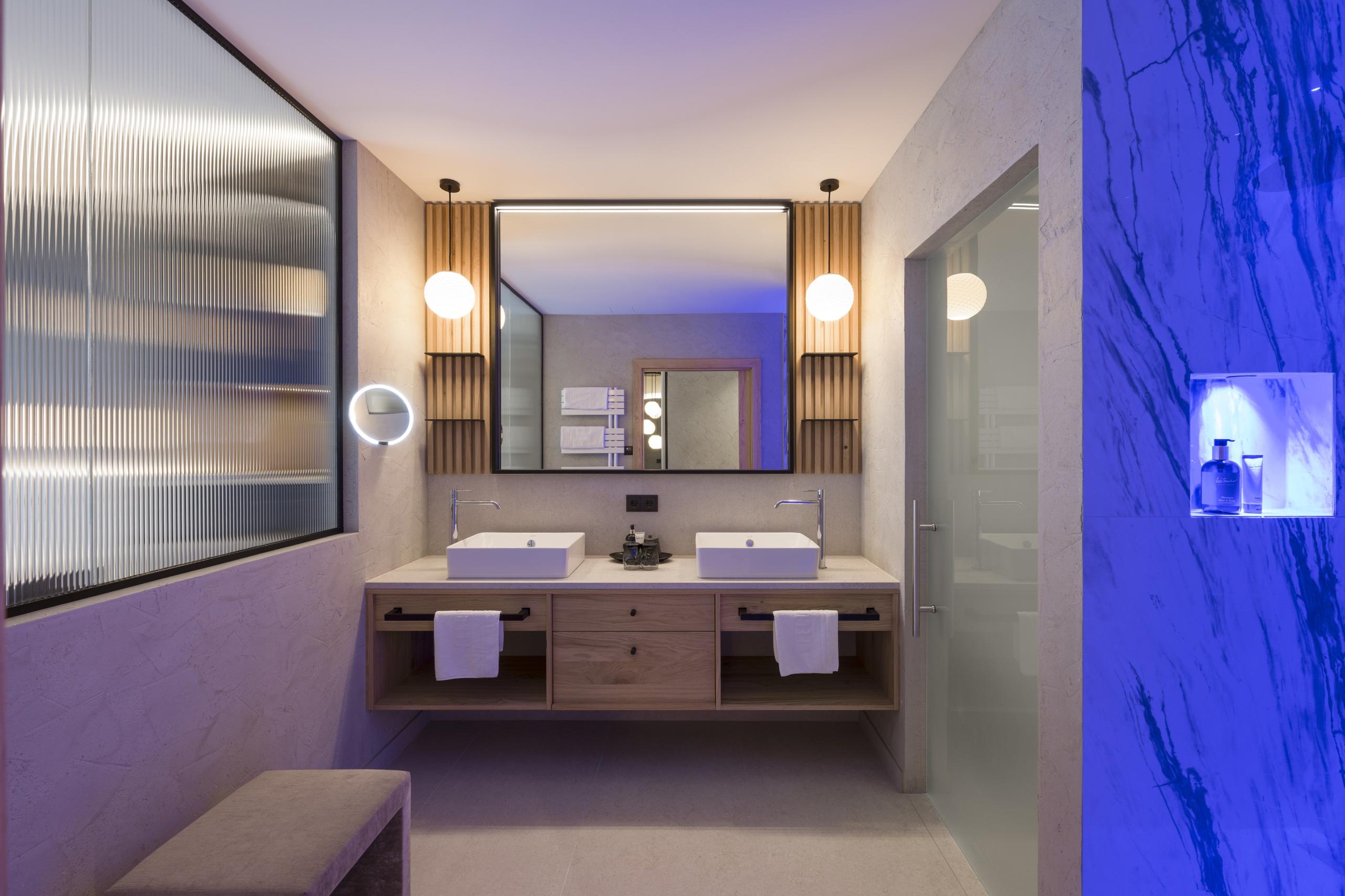 48 m² - Our Mediterranean Suite is pure Dolce Vita with its own special flair. The exclusive appointed living room with large, cosy seating corner and separate children's room with two single beds are the special features of this suite. Also features: wooden floor, natural wood furniture, spacious walk-in closet, modern bathroom with large walk-in shower, double basin, separate toilet, minibar, safe, 2 flat screen TV, telephone, free WiFi, large south-facing balcony with relax lounger and deck chair, a garage parking space and air conditioning.