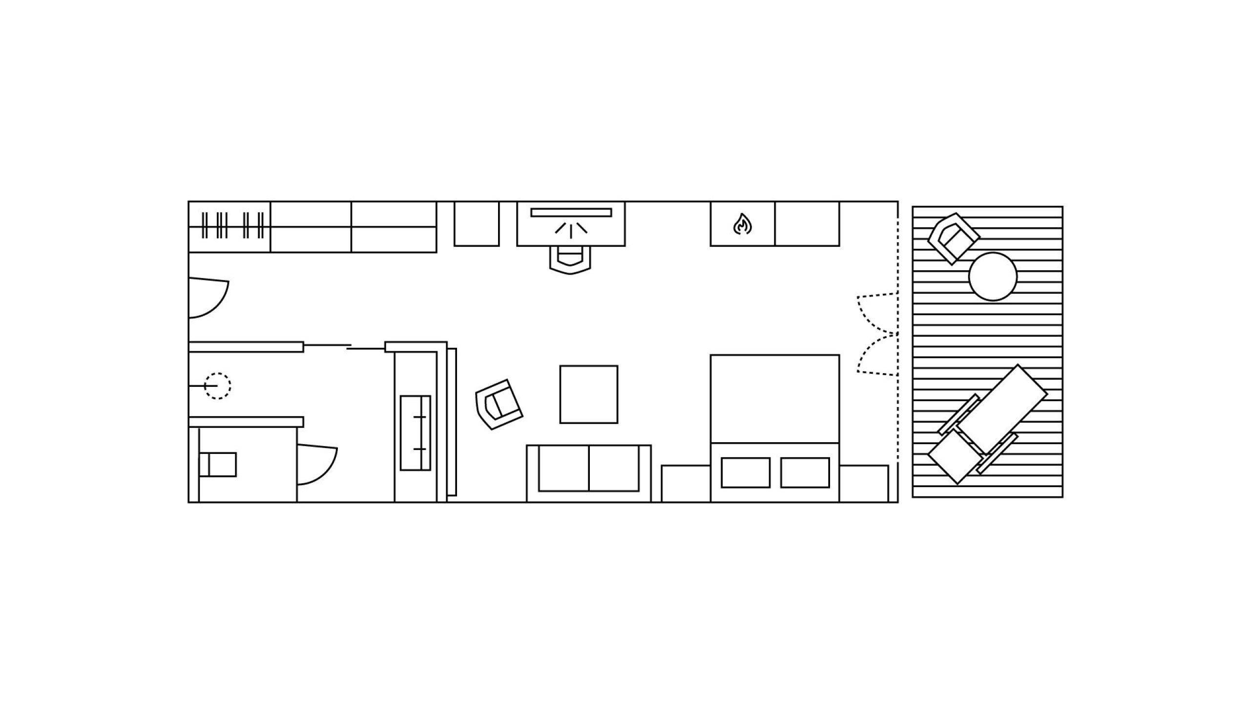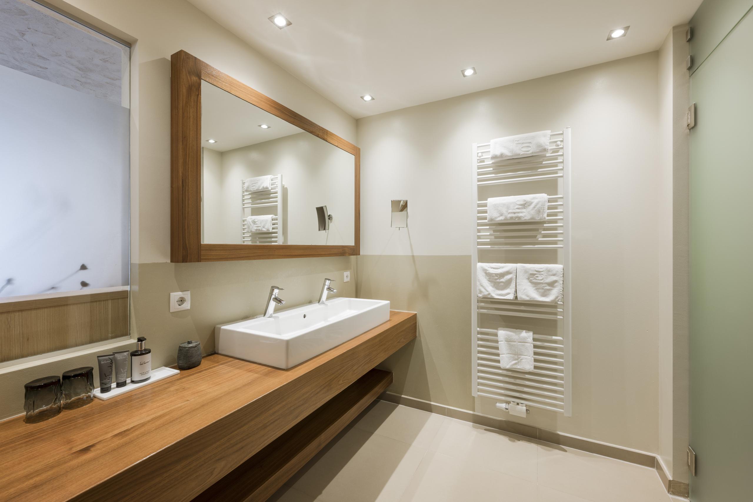 42 m² - Just to fall in love with. Our Romance Suite with an exclusive appointed living room with comfortable seating corner and armchair, wooden floor, natural wood furniture, modern bathroom with large walk-in shower, double basin, separate toilet, romantic wall-mounted fireplace with effect fire, high-quality foldaway bed for an additional person, minibar, safe, 55” flat screen TV, telephone, free WiFi, large south-facing balcony with relax lounger, a garage parking space and air conditioning.