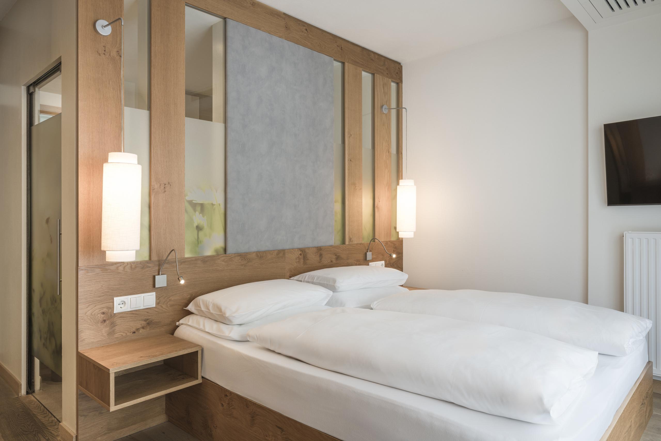 22 m² - For couples in love and best friends: our cosy Sparrow nest with comfortable chair, wooden floor, natural wood furniture, modern bathroom with large walk-in shower, toilet, minibar, safe, flat screen TV, telephone, free WiFi, north-facing balcony, a parking space in front of the hotel and air conditioning.