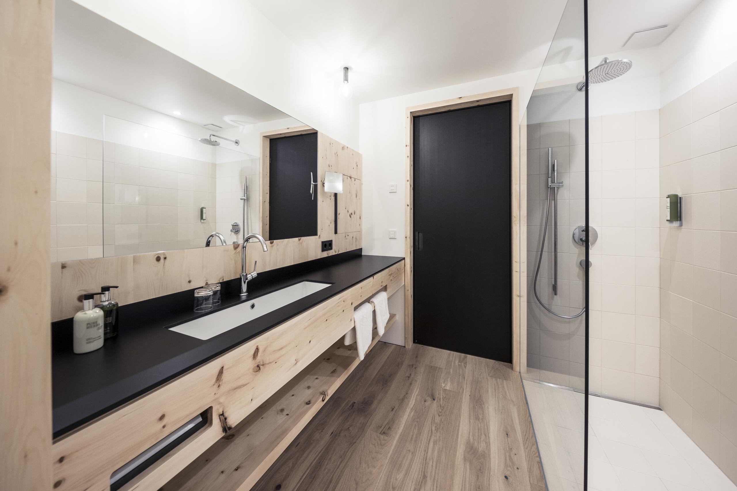 Exclusive suite in the parterre, linear, modern and furnished inlocal pine wood and with high quality materials, sleeping are with magnificen mountain viwe, cozy non separated living room, modern bathroom with shower, huge loggia and private garden at the edge of the forest.