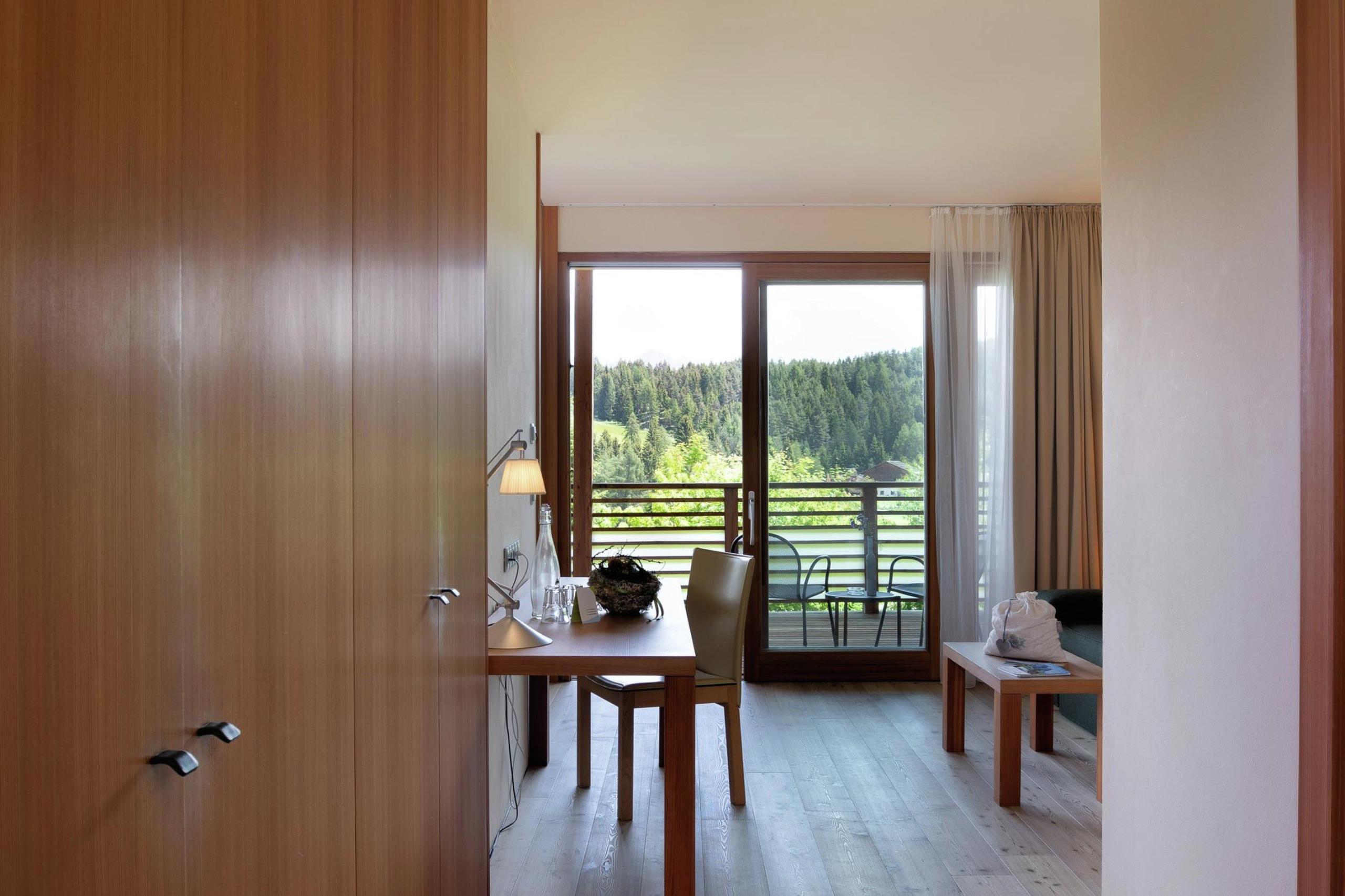 The Suite Vitalpina is a generous suite with wooden floor, view over the Dolomites: fine materials and furniture in warm colours enchant the sleeping area, the separated living area and the second sleeping room, two exclusive bathrooms with WC, shower and bathtub, bathrobe, wellness bag, hairdryer, walk-in closet, safe, Sat-TV, minibar, WI-FI, big terrace on the eastern side with marvellous mountain panorama view, private sunbathing area to the west side.