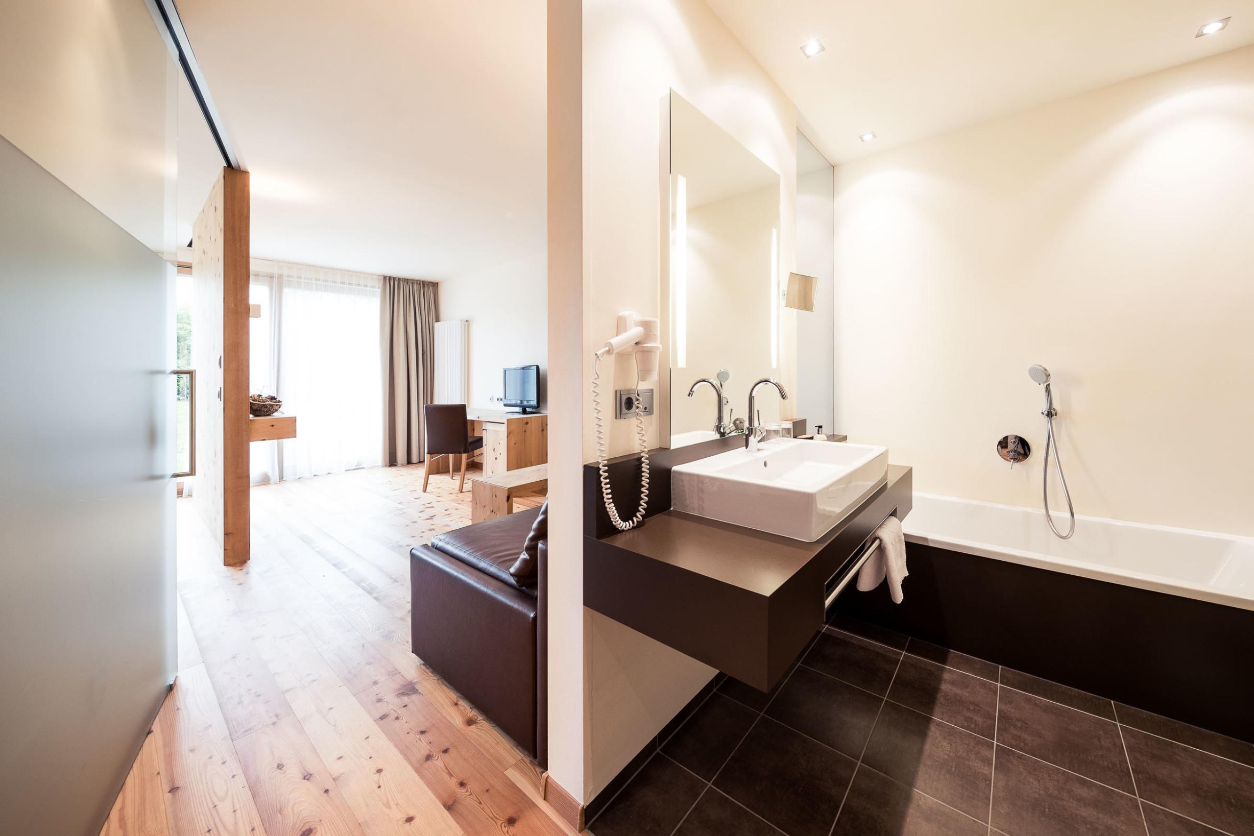 The Zirben Suite is an amazing suite in the annex (ground floor) with wonderful view over the Dolomites: furnished in swiss stone pine wood, the king of the alpine woods, which increases the sleeping quality.