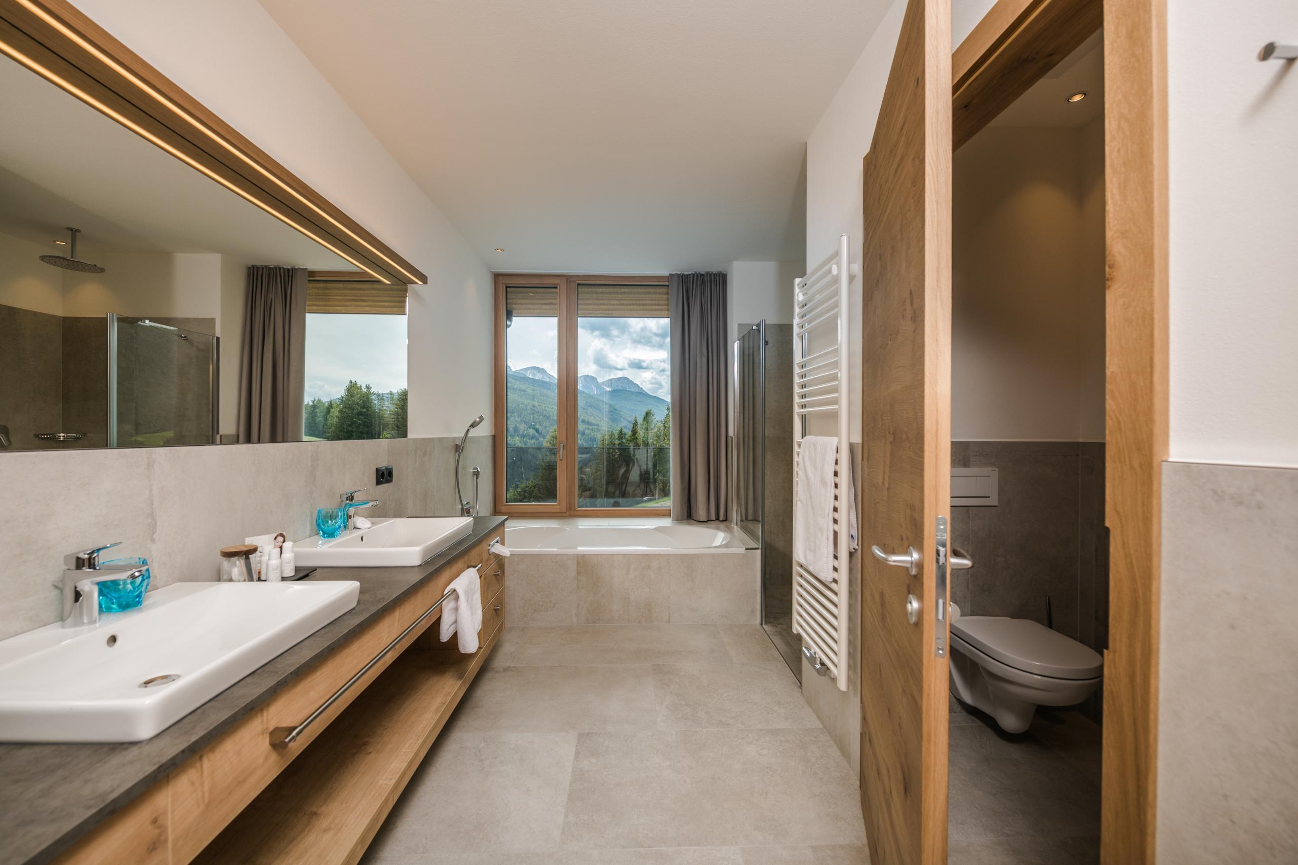 Wooden flooring. Comfortable double bed (2.10 m) with spectacular views of the alpine scenery. Relaxation corner with „The Flame“ fireplace. 55-inch flat screen. Free WiFi. Safe. Mini-bar and assortment of wines. Cremesso coffee machine. Roof terrace with scenic bathtub and gorgeous views. Luxury bathroom with two-person shower and bath. Hair dryer and make-up mirror. Separate toilet and bidet. Second bedroom with double bed, flat screen TV and en-suite bathroom. Wellness bag with bathrobes, bath towels and slippers. Underground parking included.
