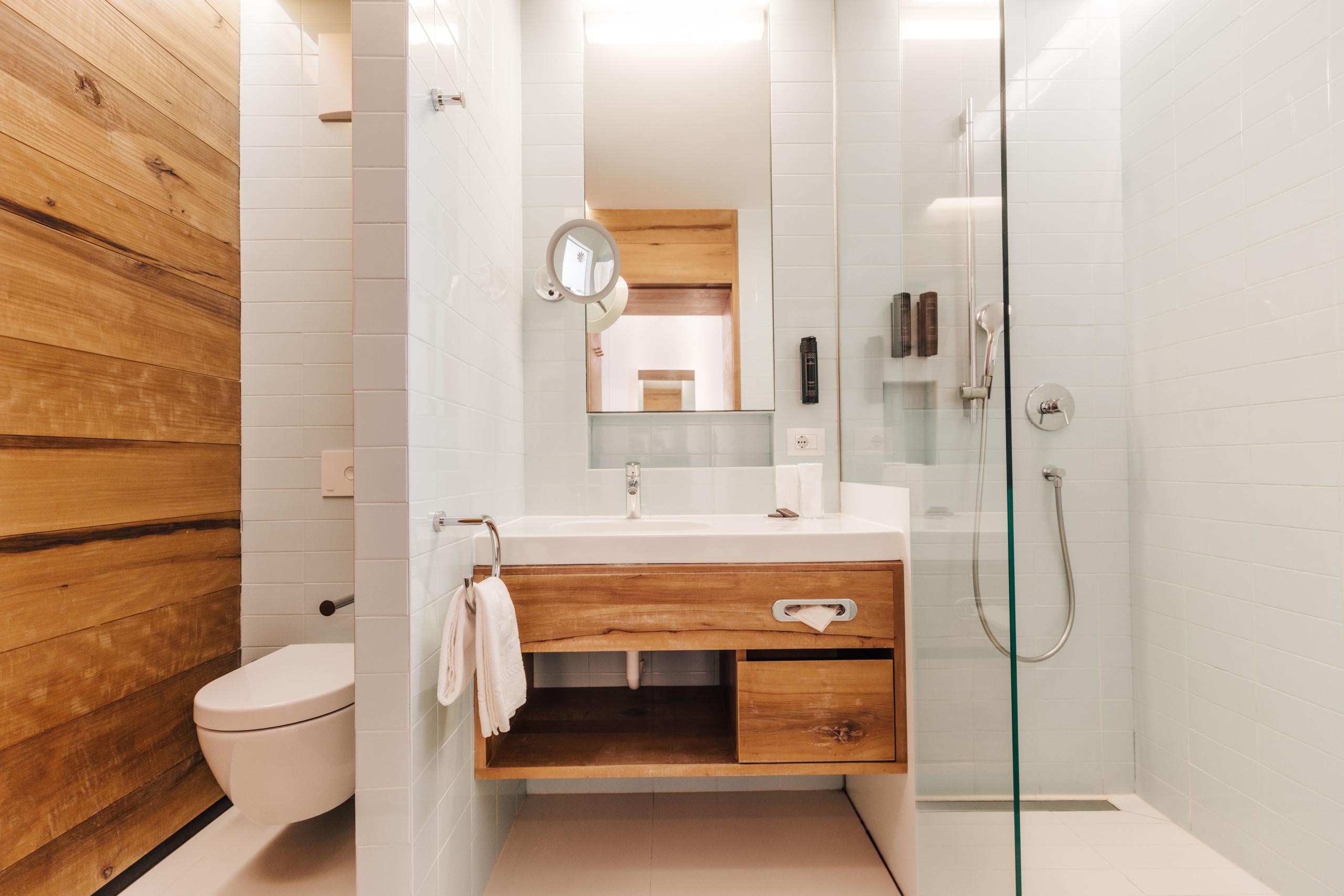 The double room has a modern look, with handmade solid pear wood furnishings, retro-style seating and accessories made of local felt – for an authentic Tyrolean feel-good ambience. The panoramic window offers fantastic views of the surrounding mountains. With modern climate ceiling for pleasant temperatures in every season.