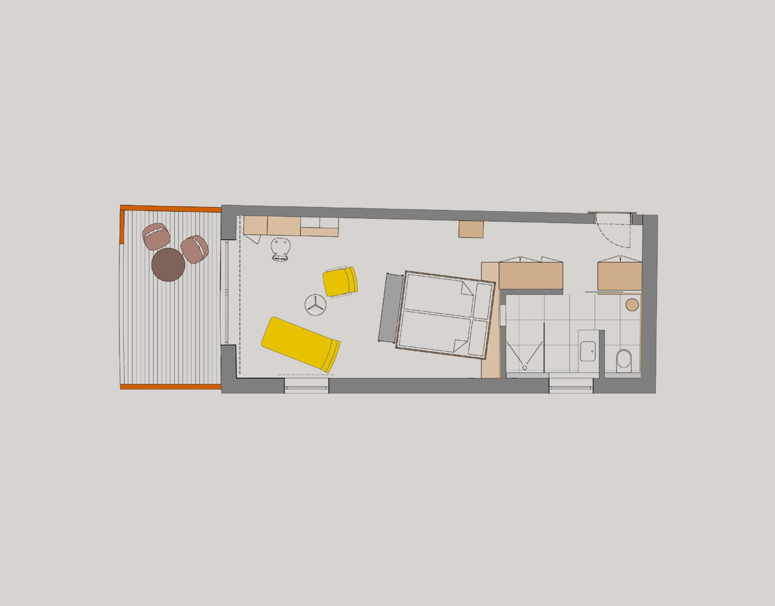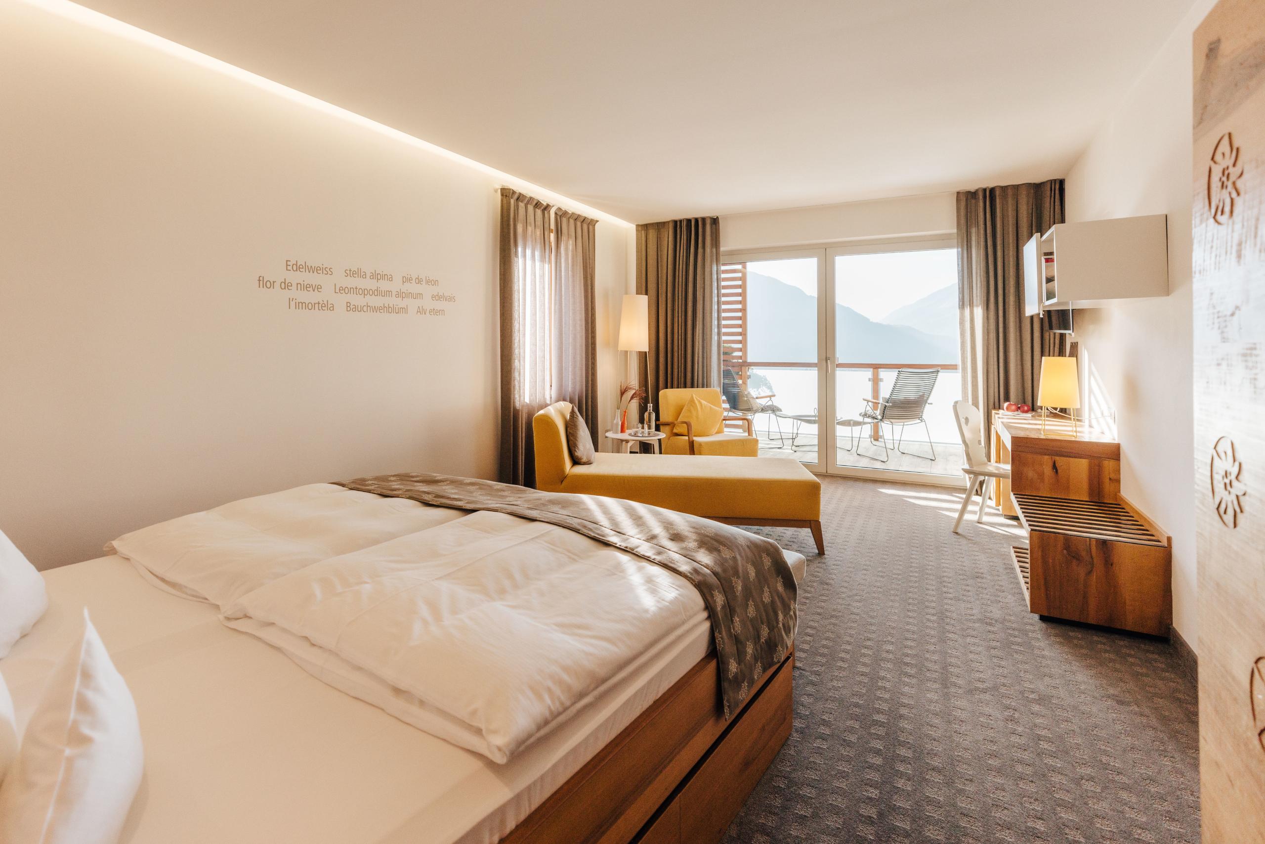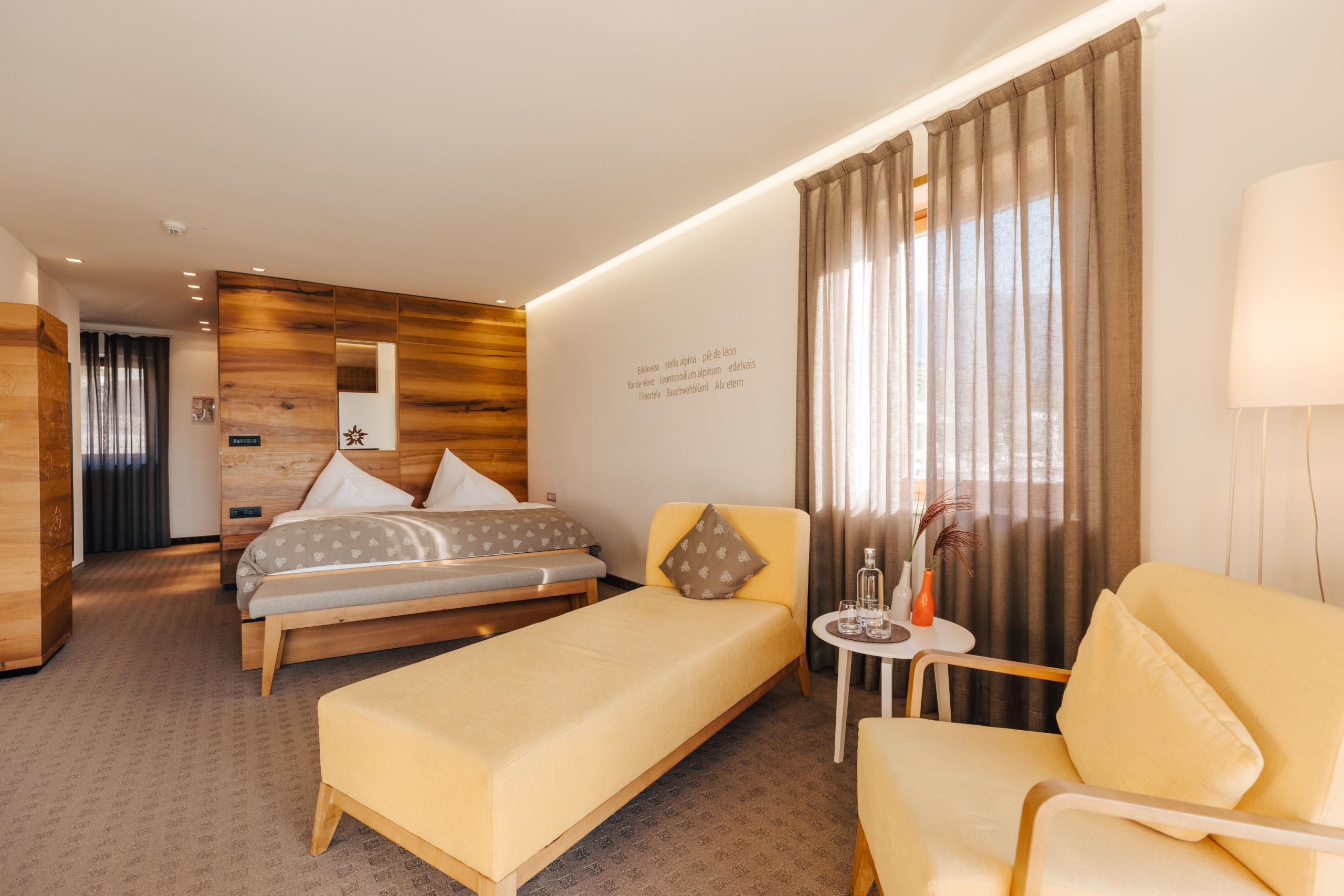 The Edelweiss rooms inspire with their modern look, where handmade solid pear wood, retro-style seating and accessories made of local felt provide an authentic Tyrolean feel-good ambience. From the bed through the panoramic windows and from the balcony, the view sweeps over the surrounding mountains. Equipped with a temperature-regulating climate ceiling. It can also be booked as a family apartment in combination with the Arnika double room.
