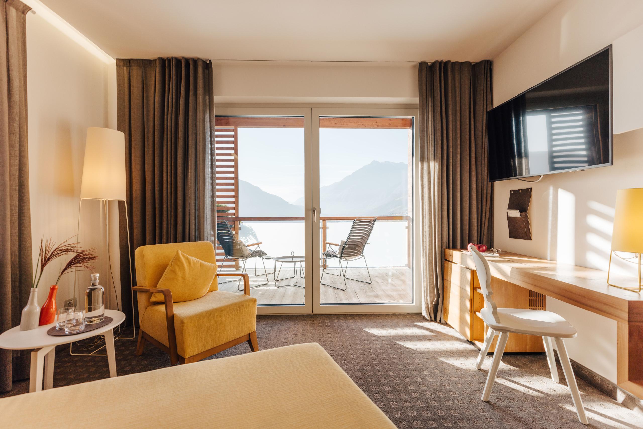 Sanctuaries of well-being in a modern Alpine style, with fine furnishings crafted from local woods, harmonious colours, and unparalleled views of the gardens and mountains. Discover your perfect retreat.