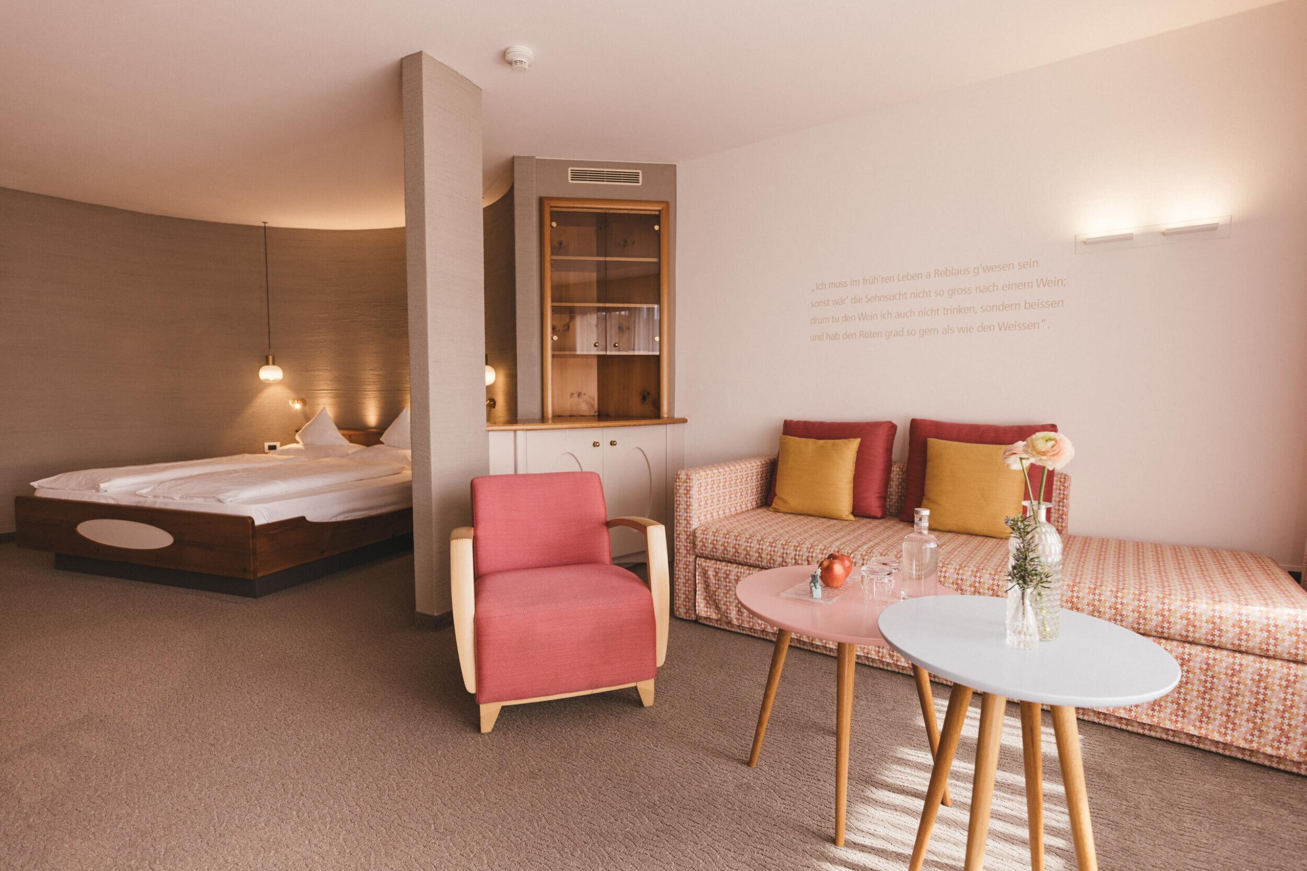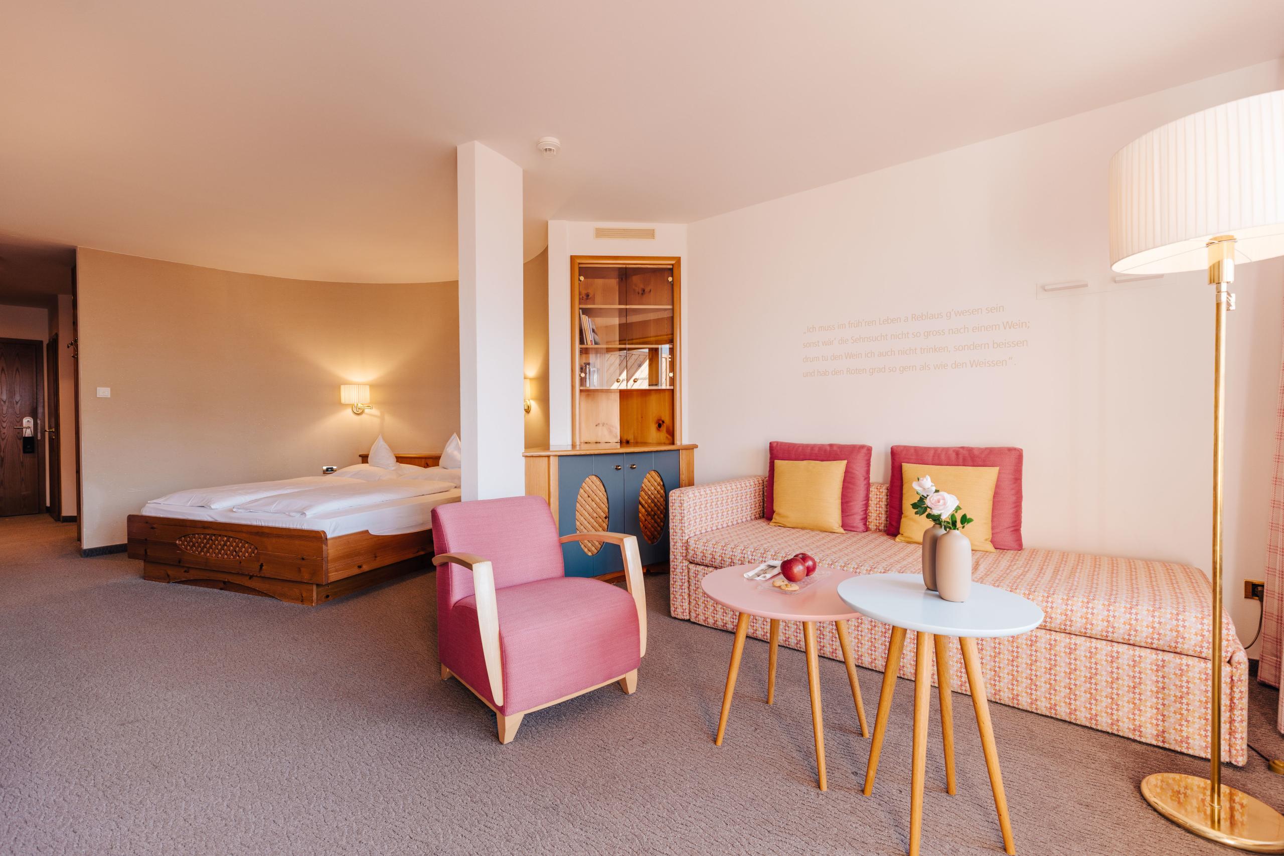 This double room is situated in a quiet location and offers wonderful views of the Hohenwart garden and Meran and Environs. The cosy retro style with a modern colour palette and natural spruce wood offers stylish comfort. Cosy wooden floors and terraces on the first floor and carpeted floors and balconies on the second floor are inviting and promise relaxation and holiday bliss. All rooms have a temperature-regulating climate ceiling. Dogs are not allowed in this room.